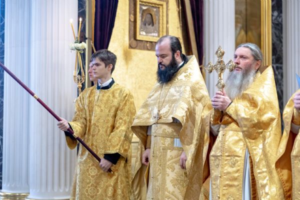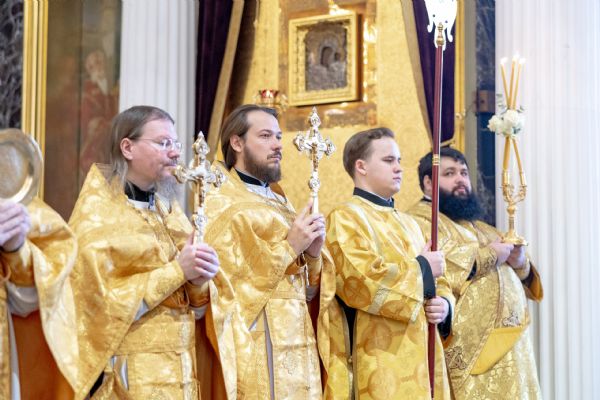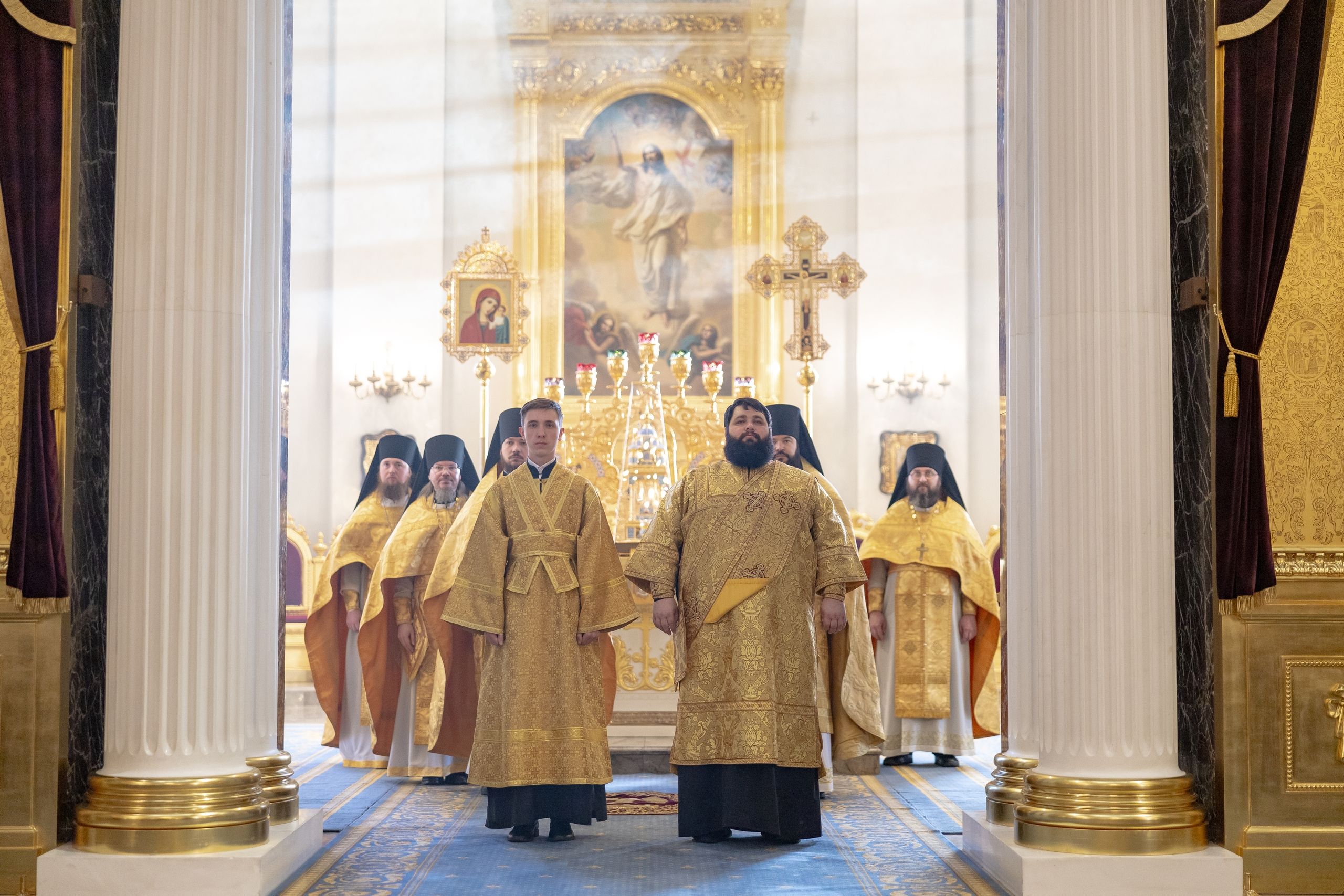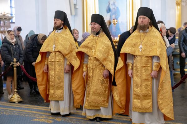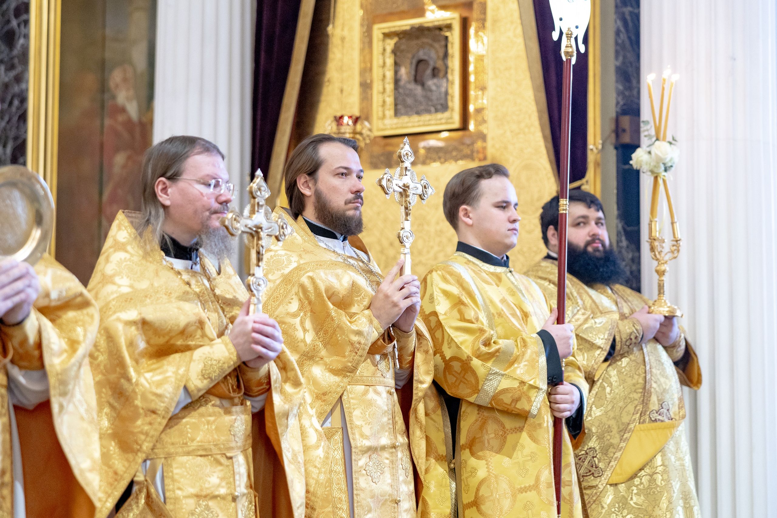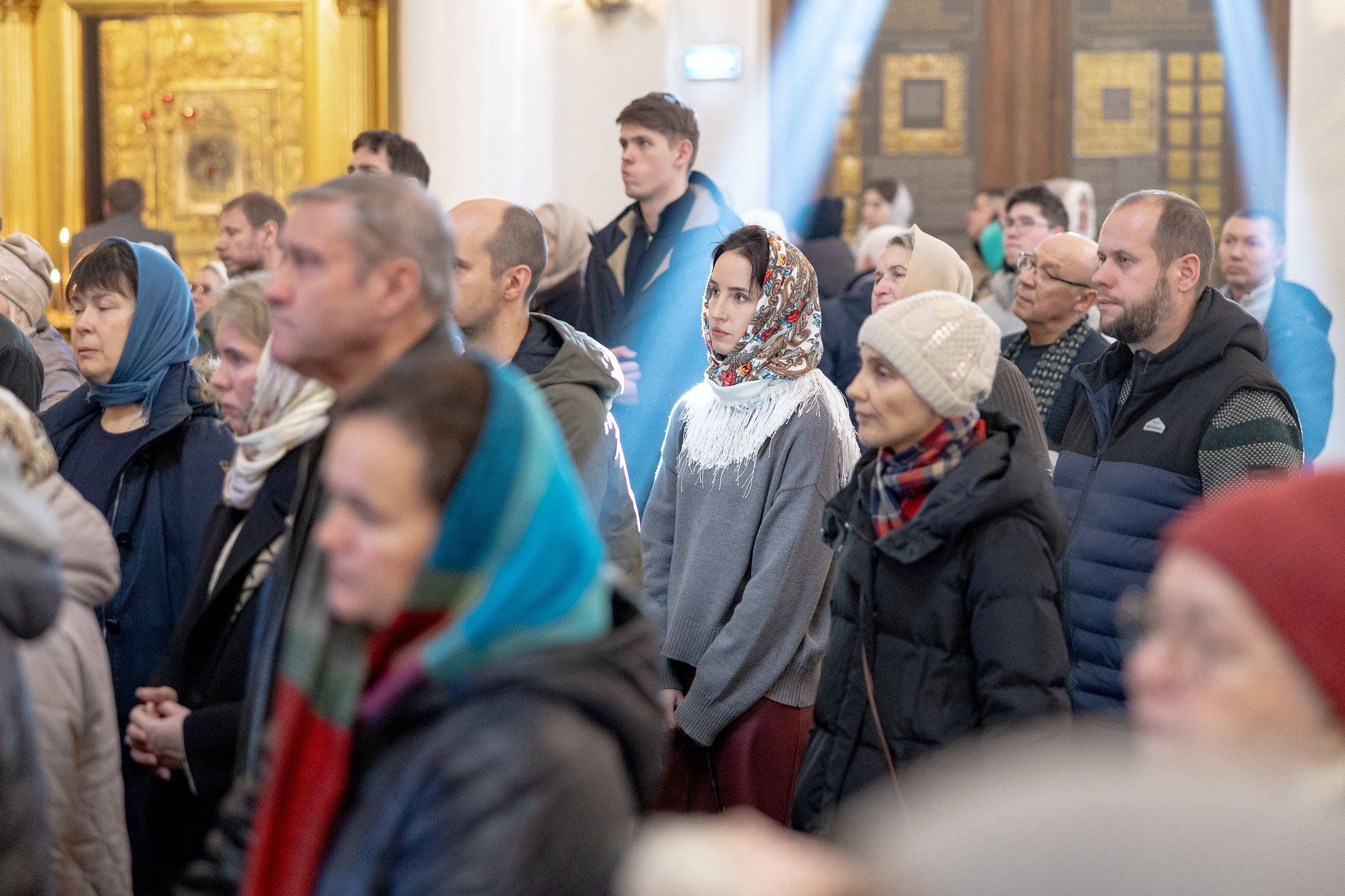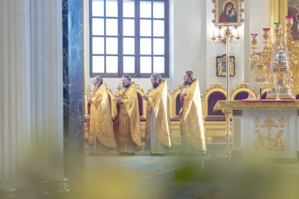 На мирной и сугубой ектениях были вознесены молитвенные прошения о Российском воинстве и о мире. По запричастном стихе проповедь произнёс иеромонах Гермоген (Рубан).