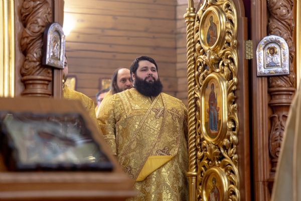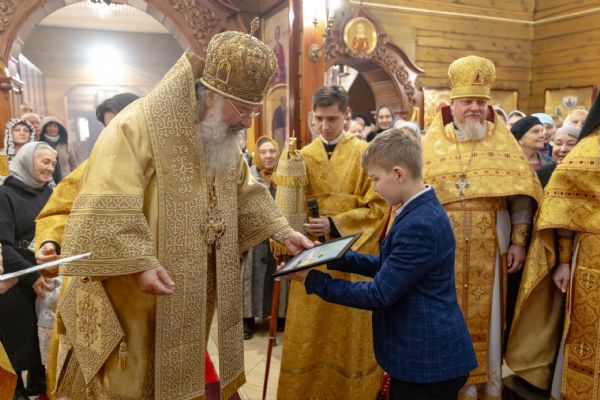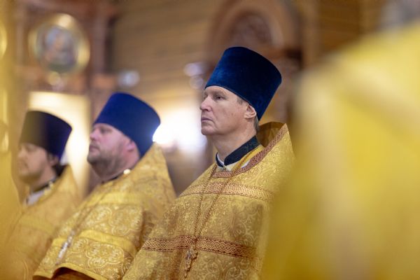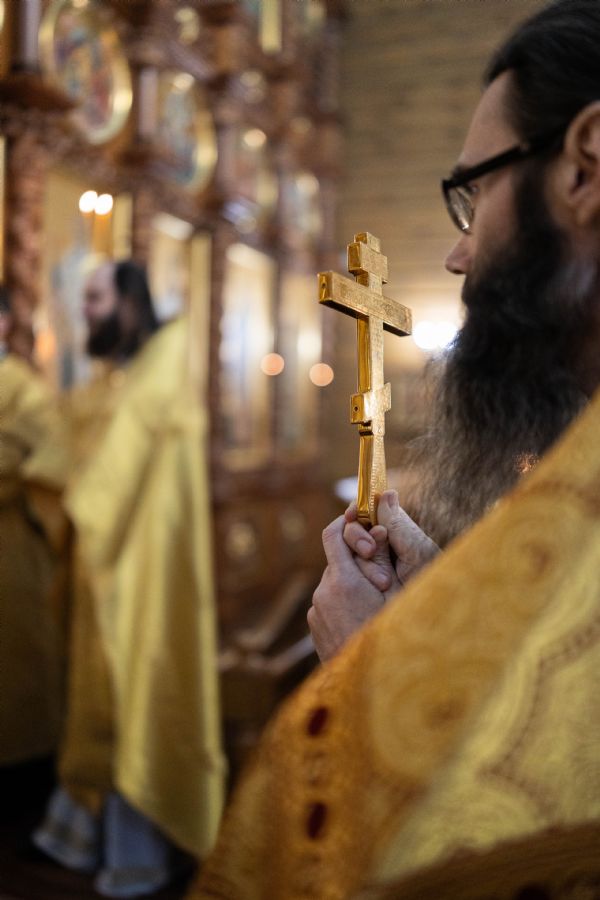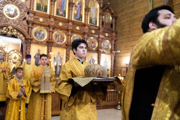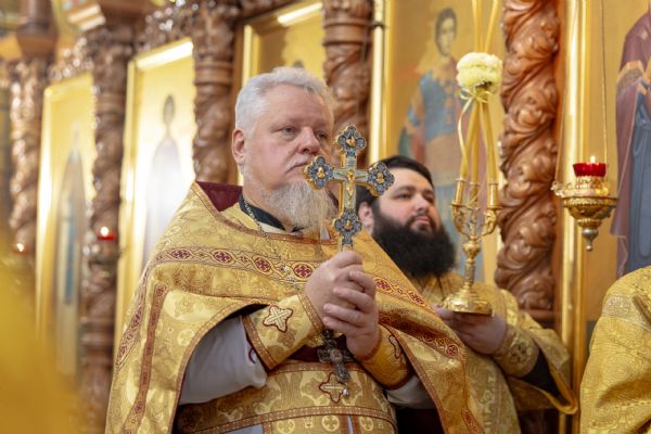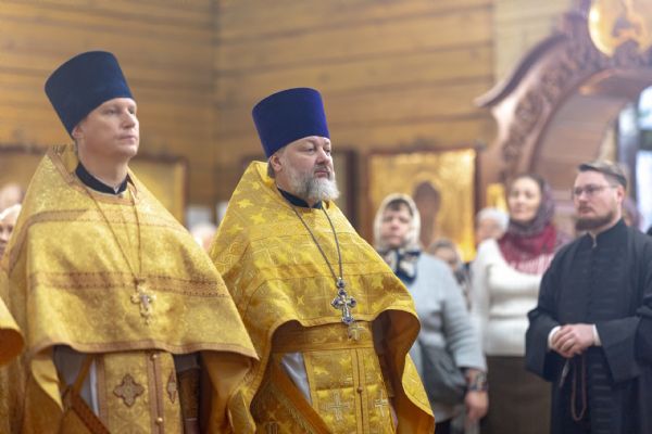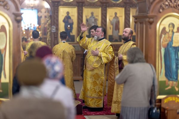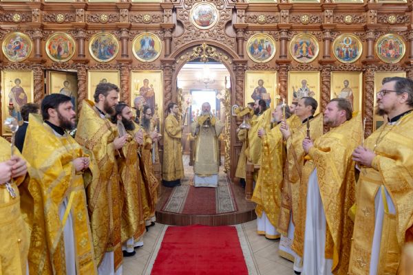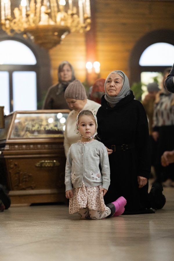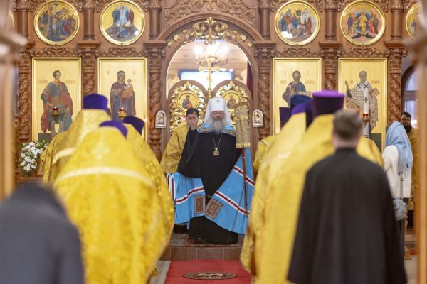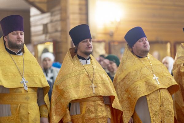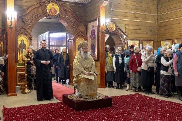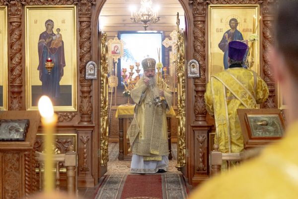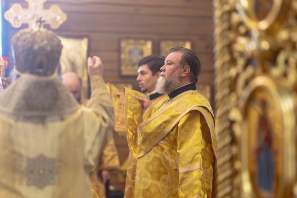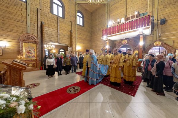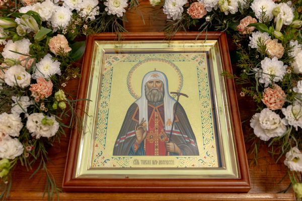 На мирной и сугубой ектениях были вознесены молитвы о Российском воинстве и о мире. По запричастном стихе проповедь произнёс иерей Евгений Марданов. В завершение было совершено славление святителю Тихону, Патриарху Московскому и всея России.