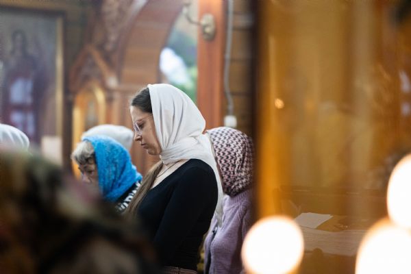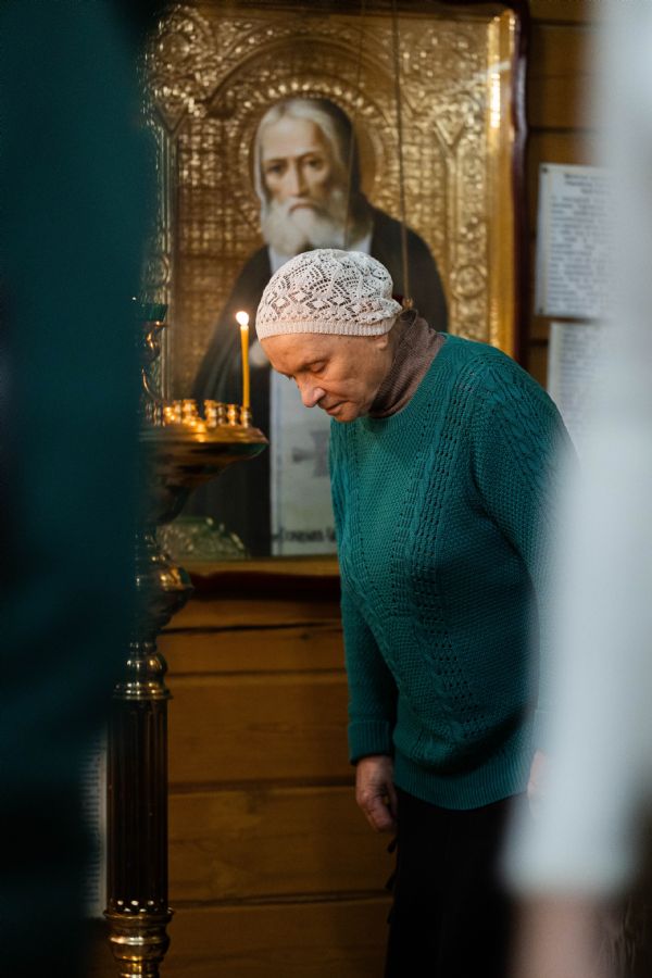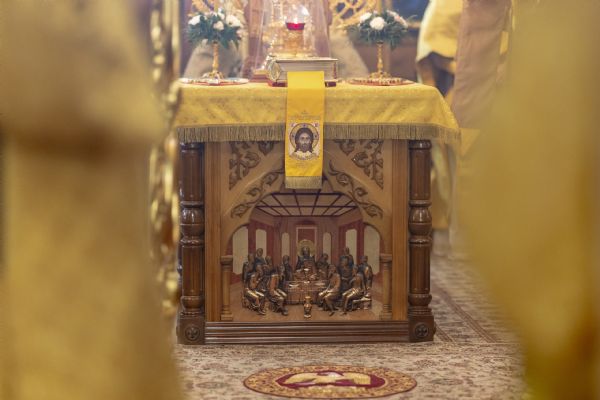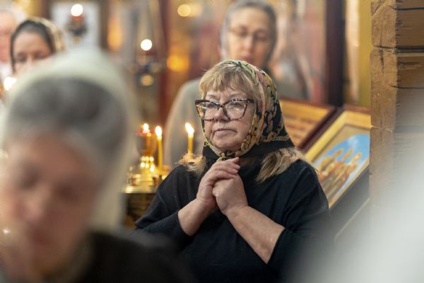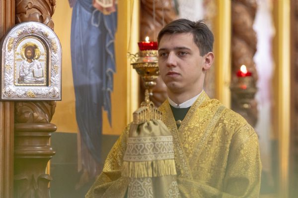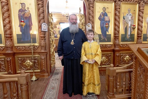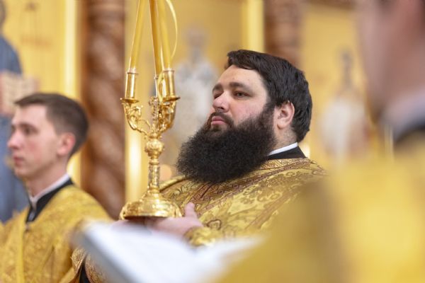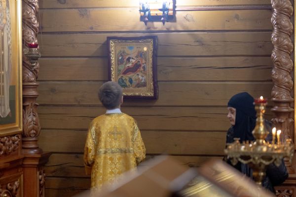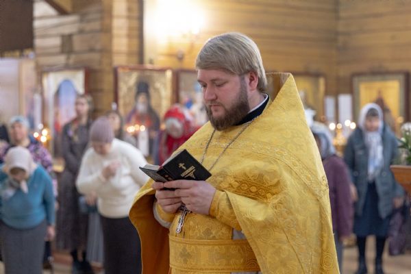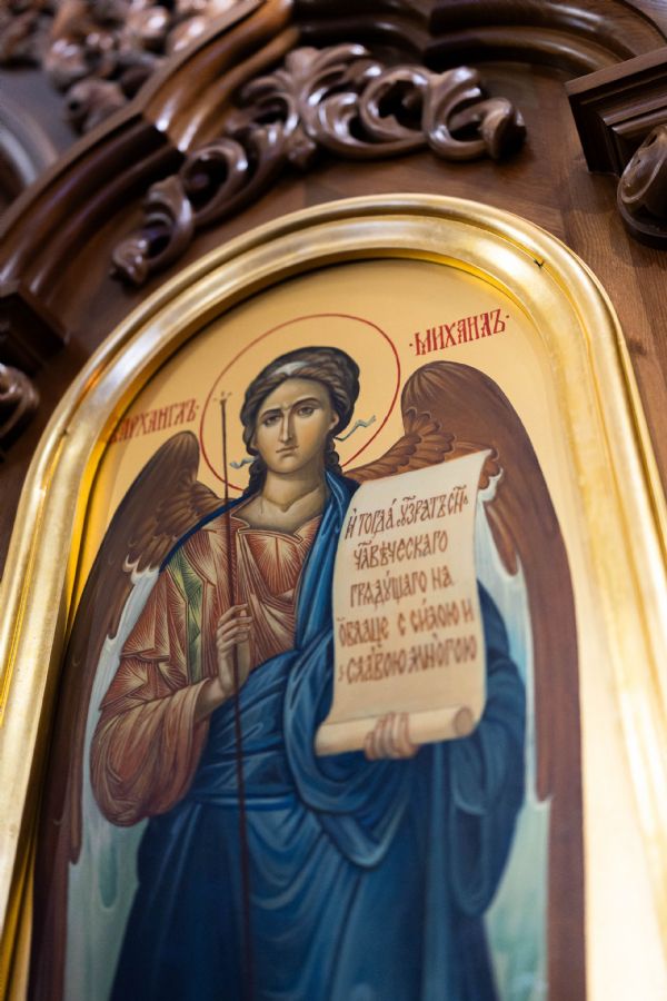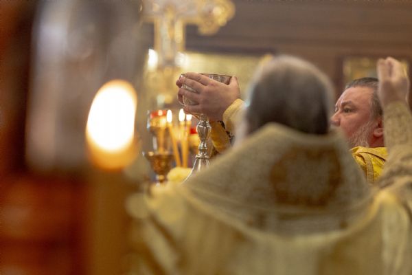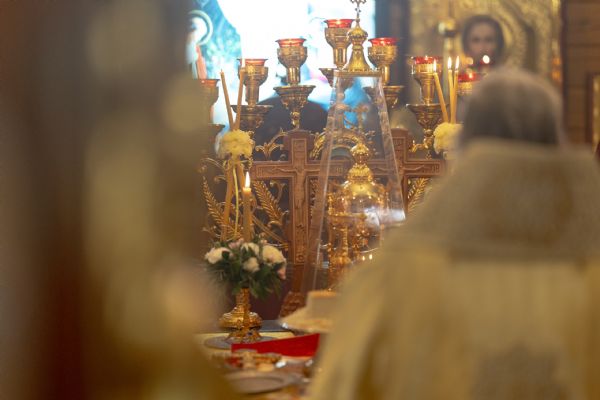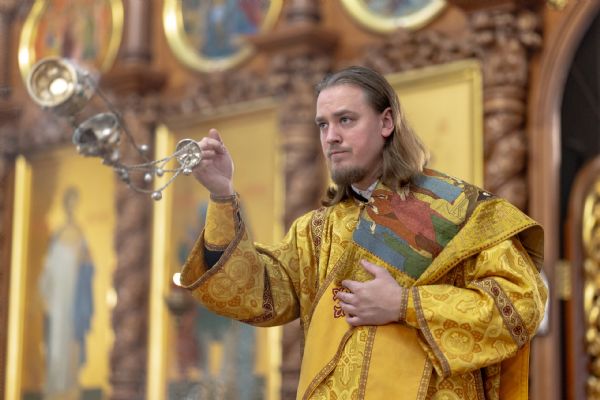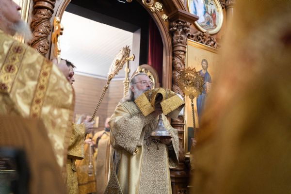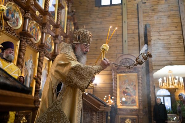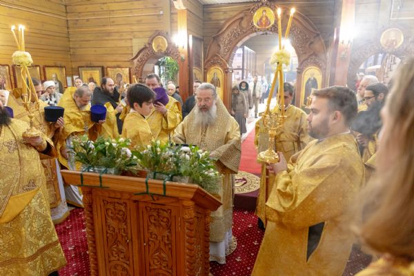 На мирной и сугубой ектениях были вознесены молитвы о Российском воинстве и о мире. По запричастном стихе проповедь произнёс иерей Евгений Марданов. В завершение было совершено славление святителю Тихону, Патриарху Московскому и всея России.