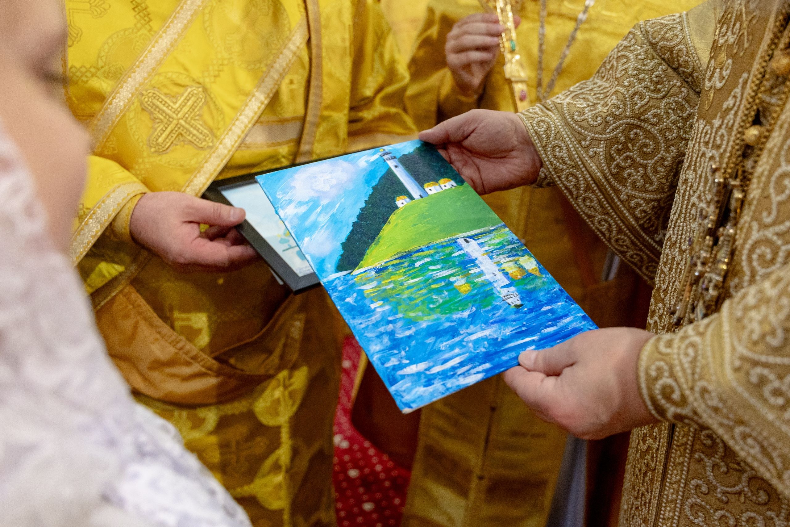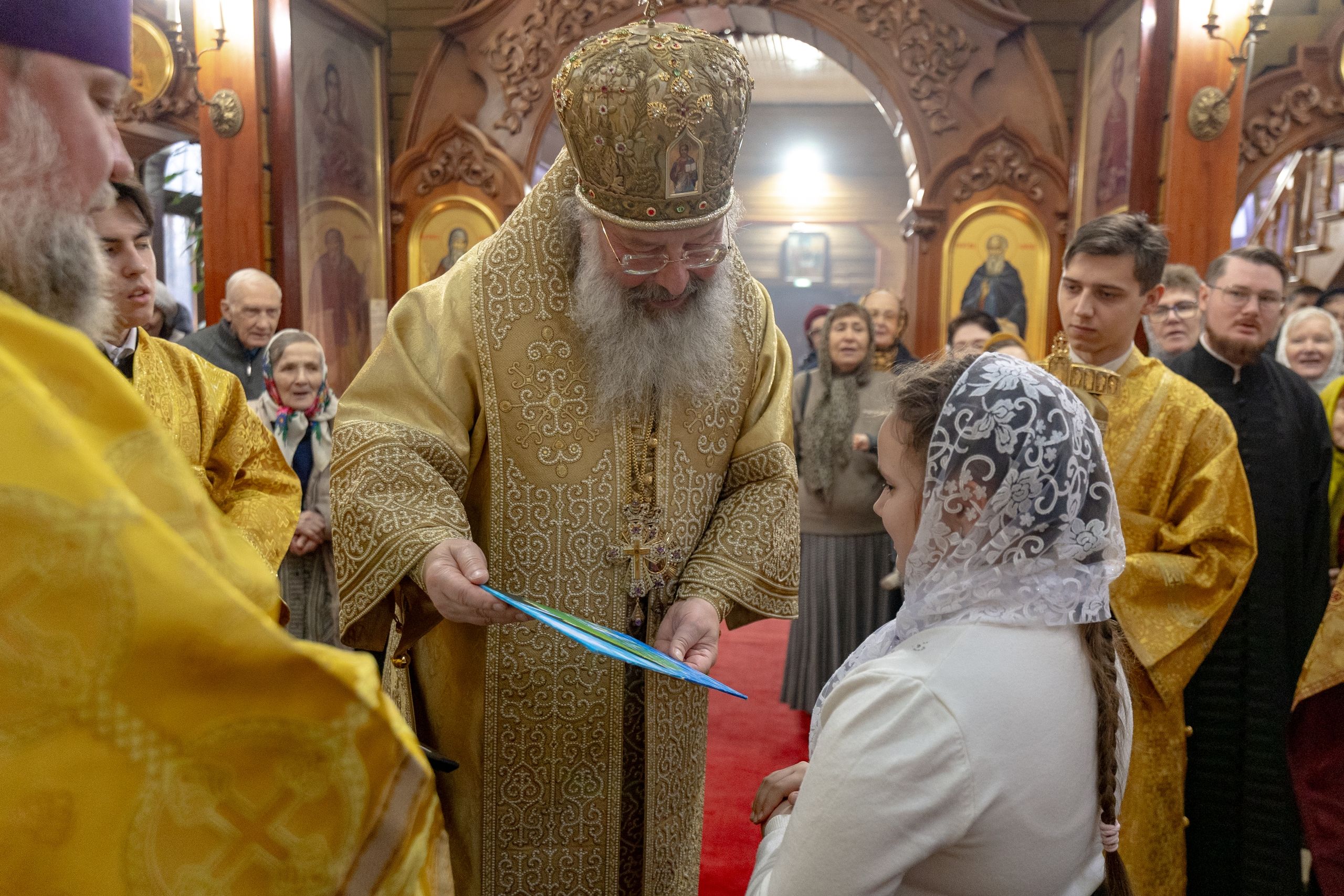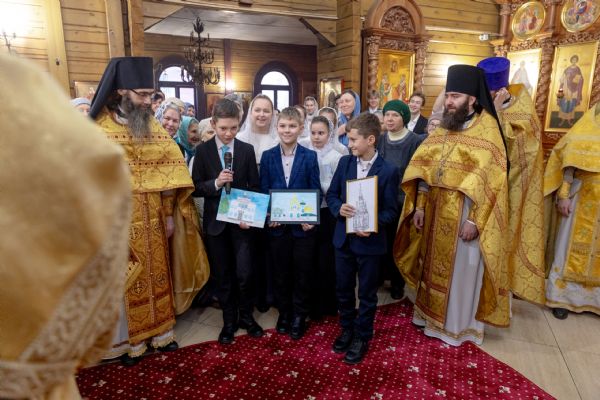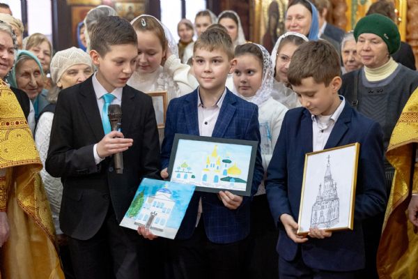 Митрополит Кирилл тепло поприветствовал певчих детского хора Боголюбского храма города Пушкино и руководителя коллектива матушку Надежду Клименко. Дети вручили архипастырю подарки ручной работы.
