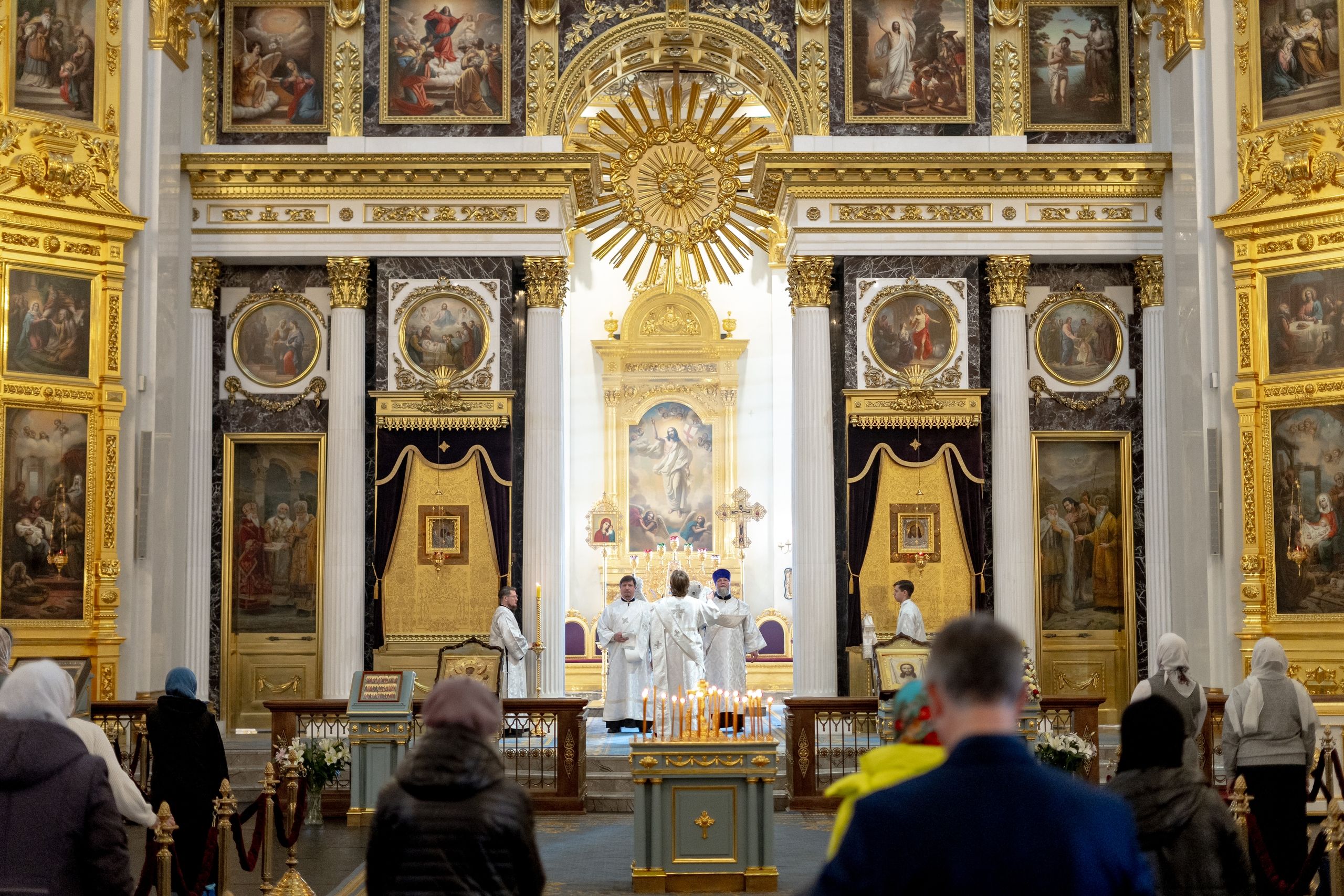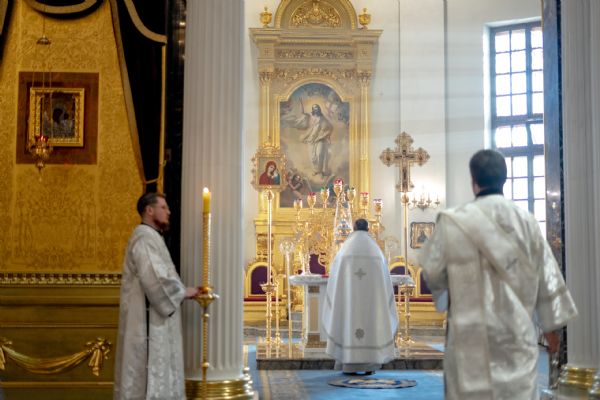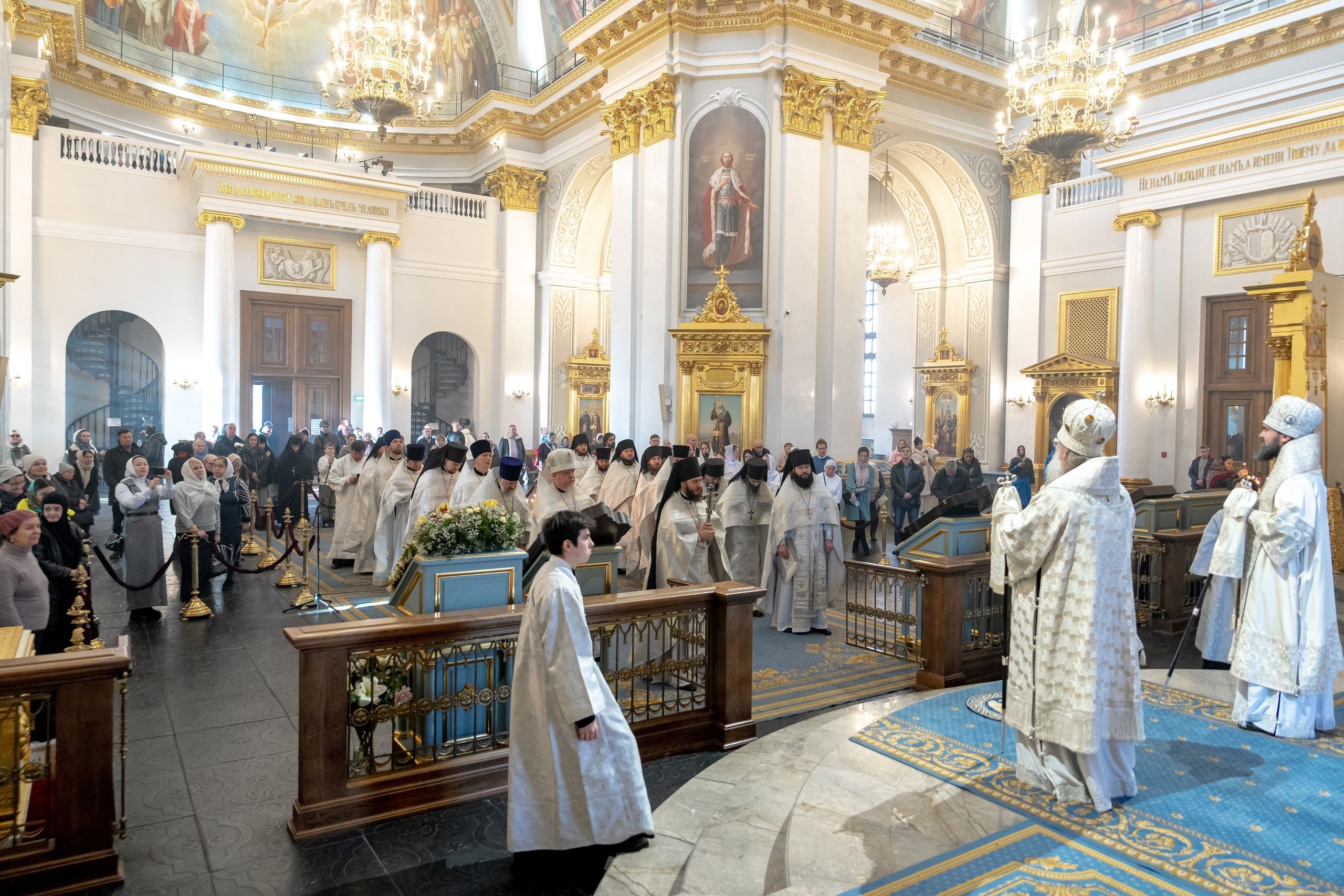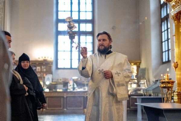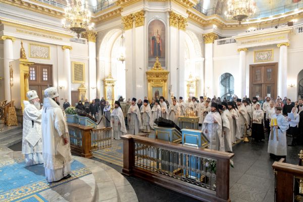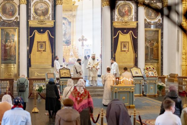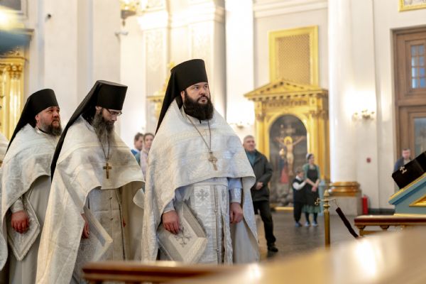 На мирной и сугубой ектениях были вознесены молитвы о Российском воинстве и о мире. В сугубую ектению были включены особые прошения о здравии Святейшего Патриарха Кирилла. Также особо молились об упокоении души митрополита Феофана (Ашуркова). По запричастном стихе проповедь произнёс игумен Пимен (Ивентьев).