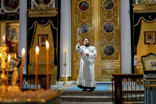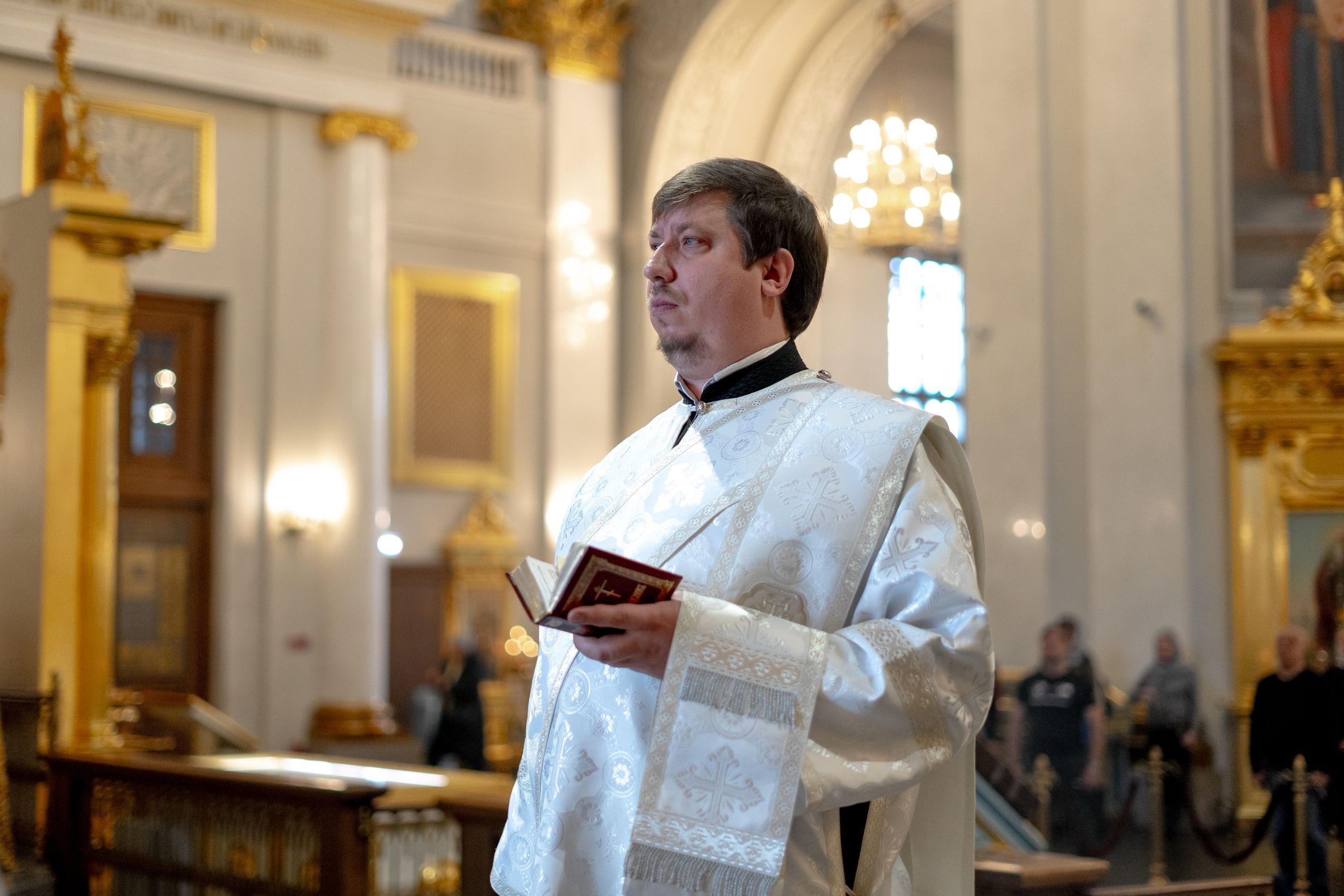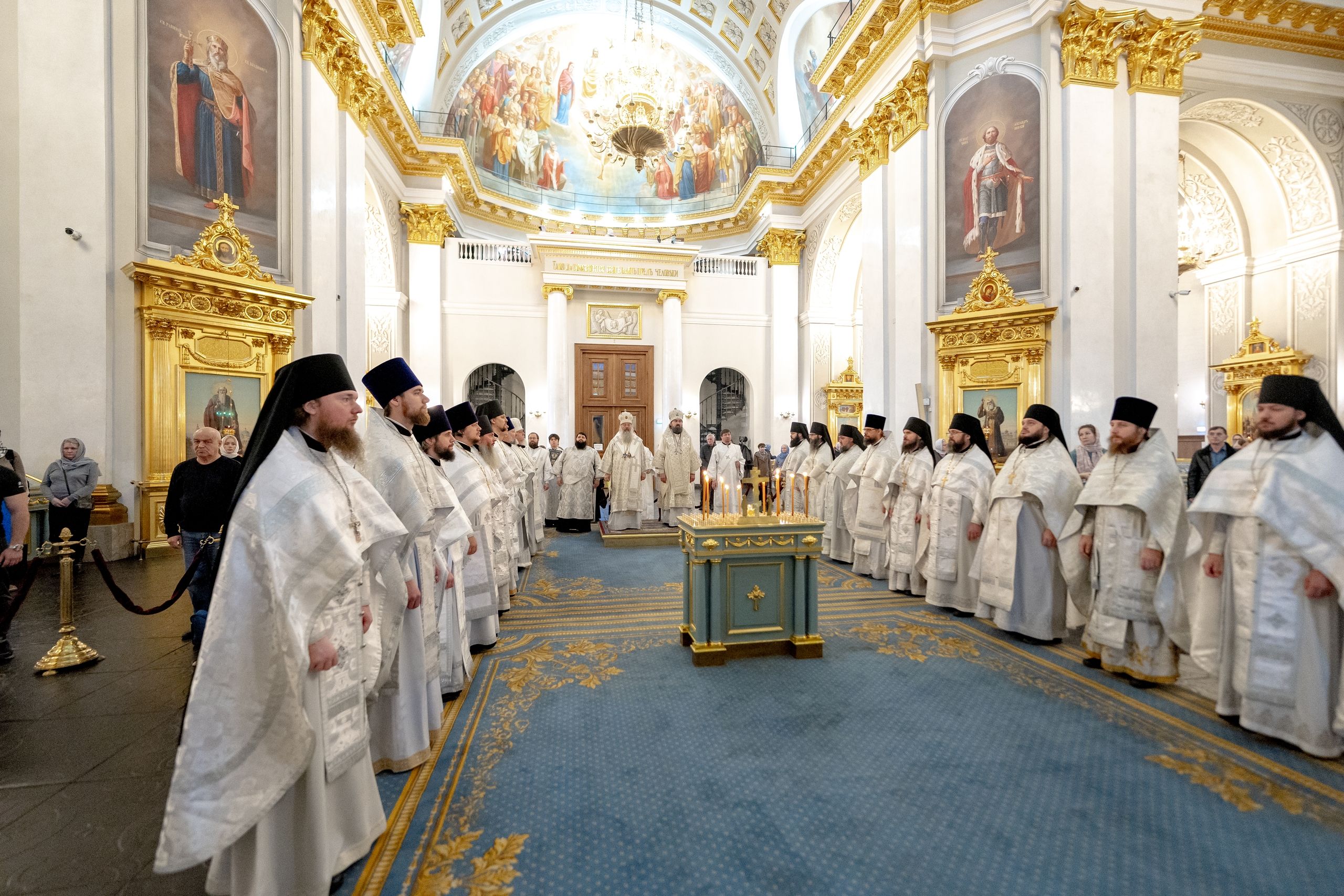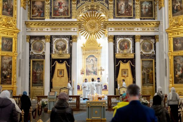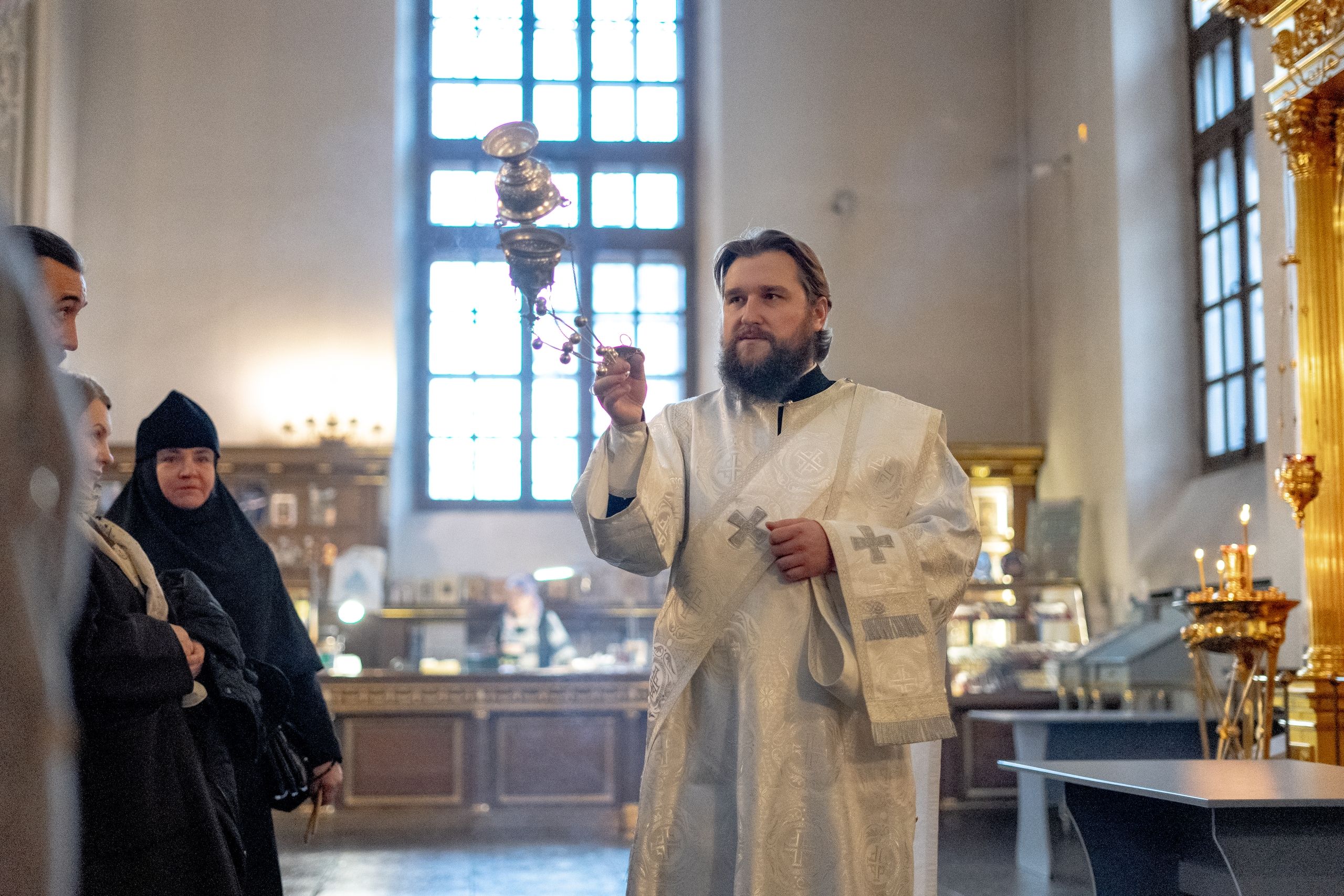 На мирной и сугубой ектениях были вознесены молитвы о Российском воинстве и о мире. В сугубую ектению были включены особые прошения о здравии Святейшего Патриарха Кирилла. Также особо молились об упокоении души митрополита Феофана (Ашуркова). По запричастном стихе проповедь произнёс игумен Пимен (Ивентьев).