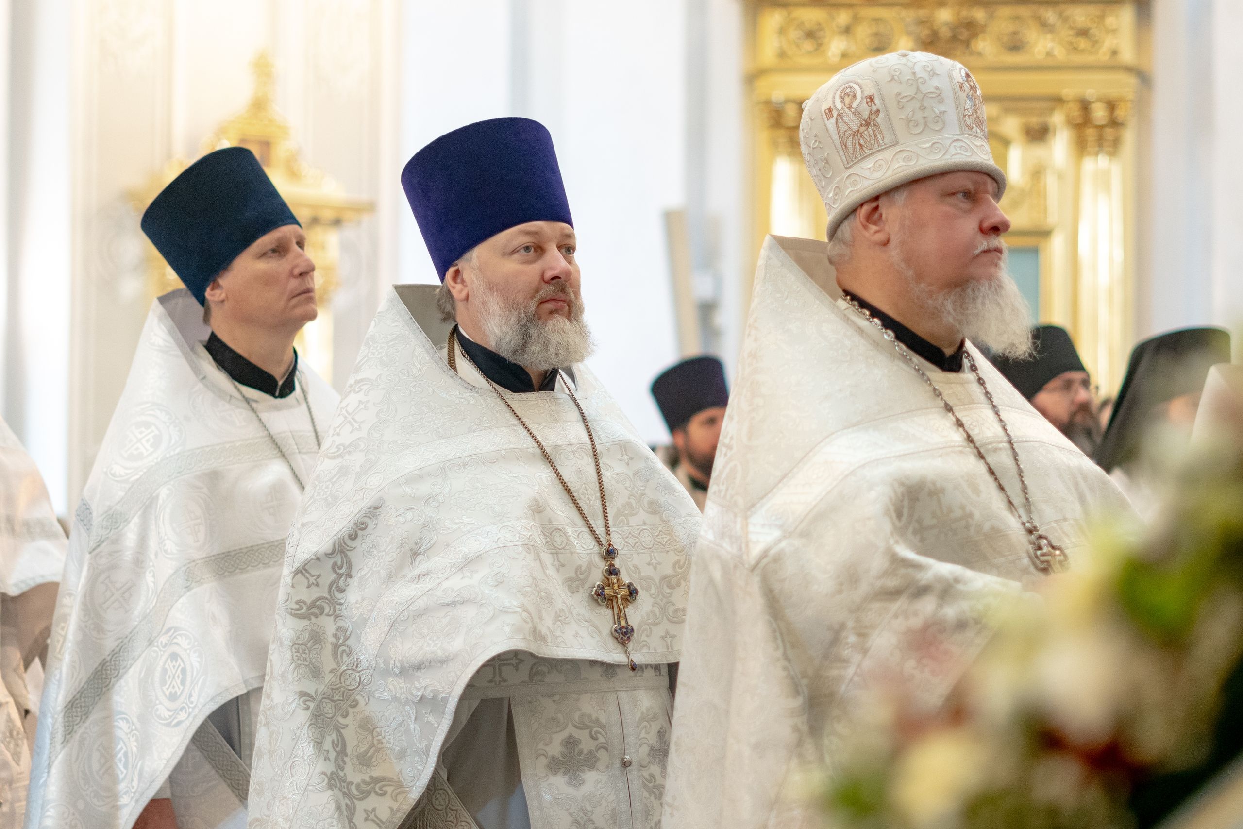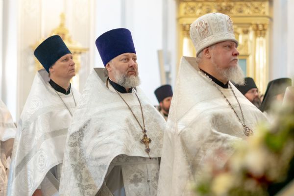 Архипастырям сослужили секретарь Татарстанской митрополии иеромонах Кирилл (Корытко), наместник Казанского Богородицкого мужского монастыря игумен Марк (Виленский), благочинный I Казанского округа протоиерей Владимир Самойленко, благочинный по монастырям Казанской епархии игумен Пимен (Ивентьев), насельники Богородицкой обители в священном сане, духовенство Татарстанской митрополии.