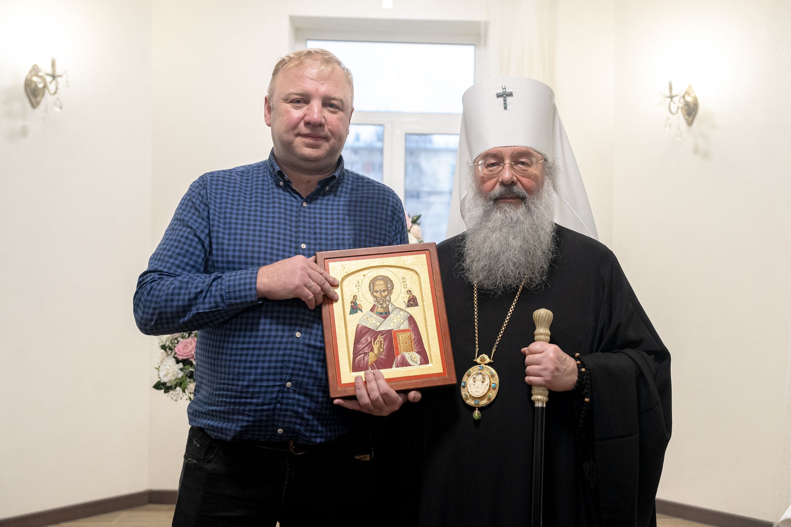 Мы только что вернулись из паломнической поездки от святителя Николая Чудотворца и святителя Спиридона Тримифунтского и хотели бы преподнести Вам образ святителя Николая, освящённый на его святых мощах. Примите его как знак благодарности от святителя Николая — одного из самых великих благодетелей, благотворителей и чудотворцев, который совершал своё служение людям. Пусть он всегда вас благословляет и не оставляет в своих святых молитвах.