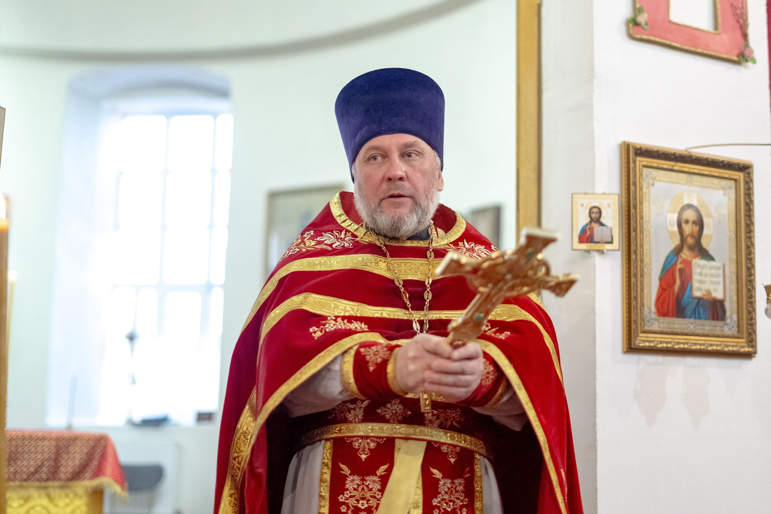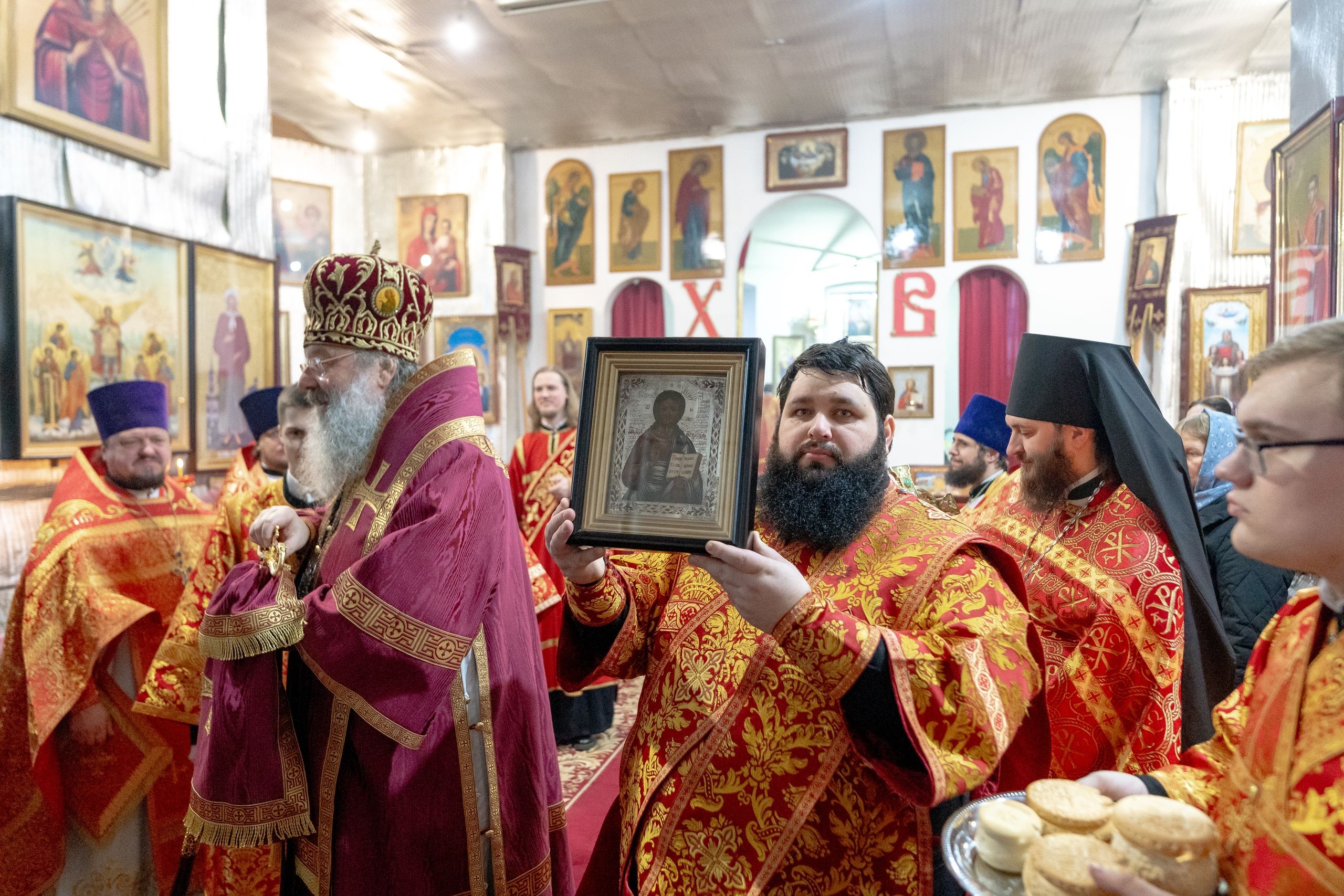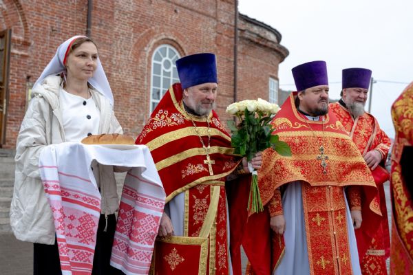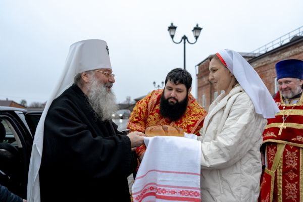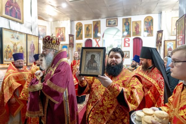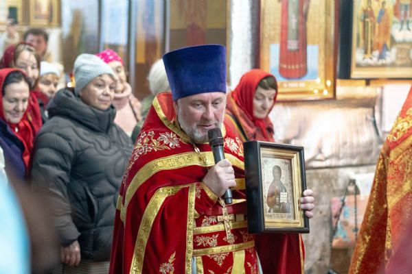 Настоятель Софийского собора иерей Сергий Гришин поблагодарил архипастыря за совместную молитву и попечение о приходе и преподнёс на молитвенную память икону Спасителя.