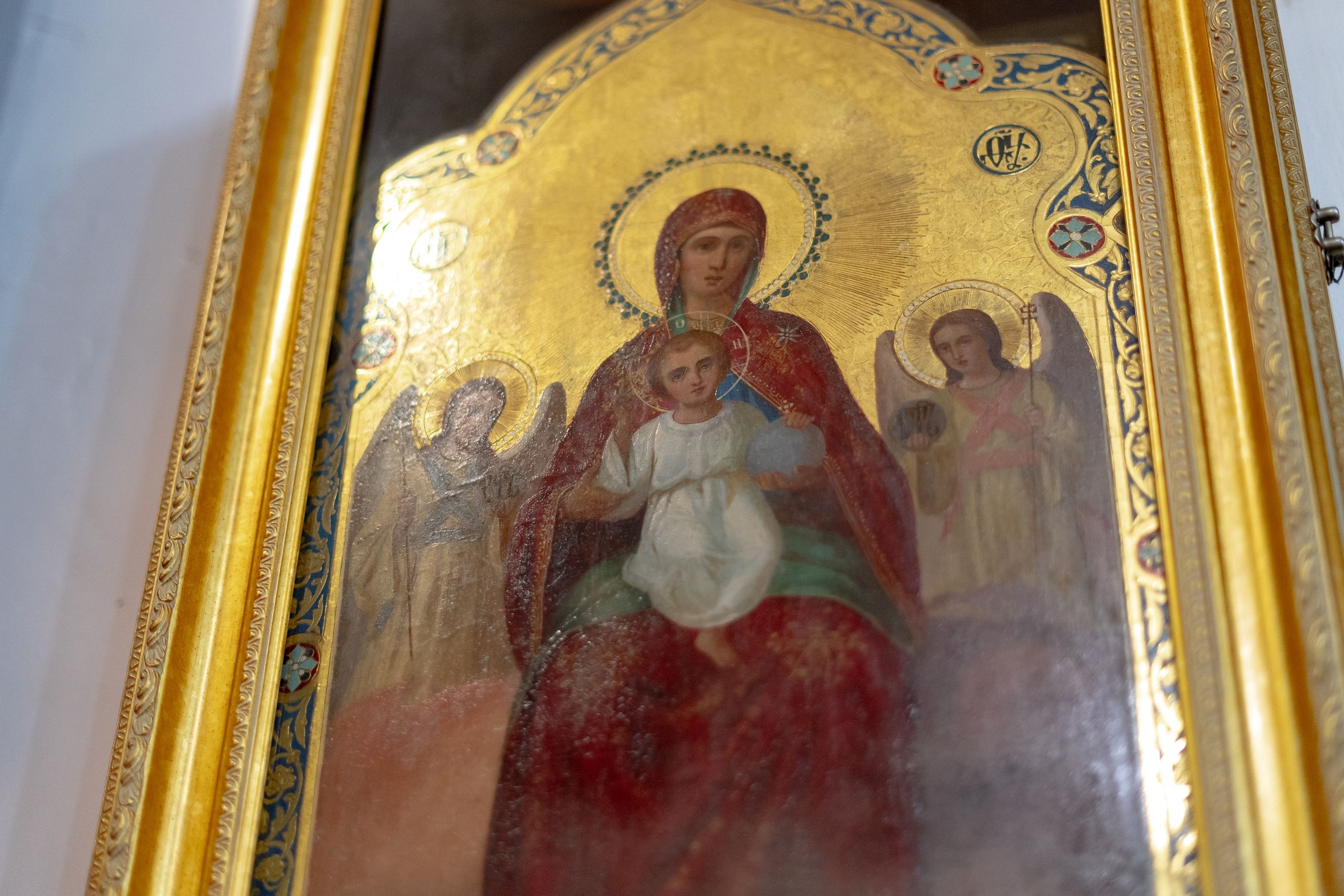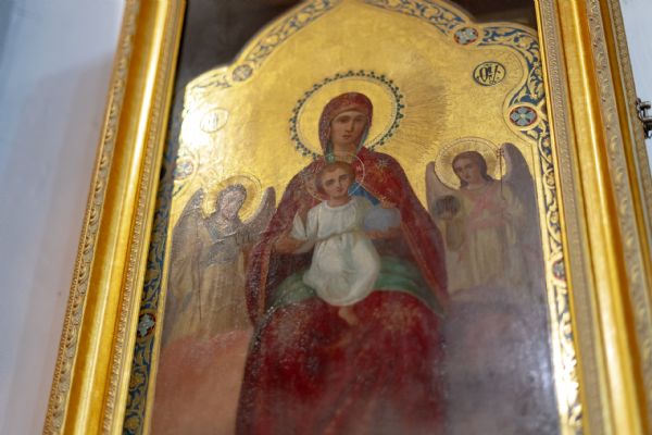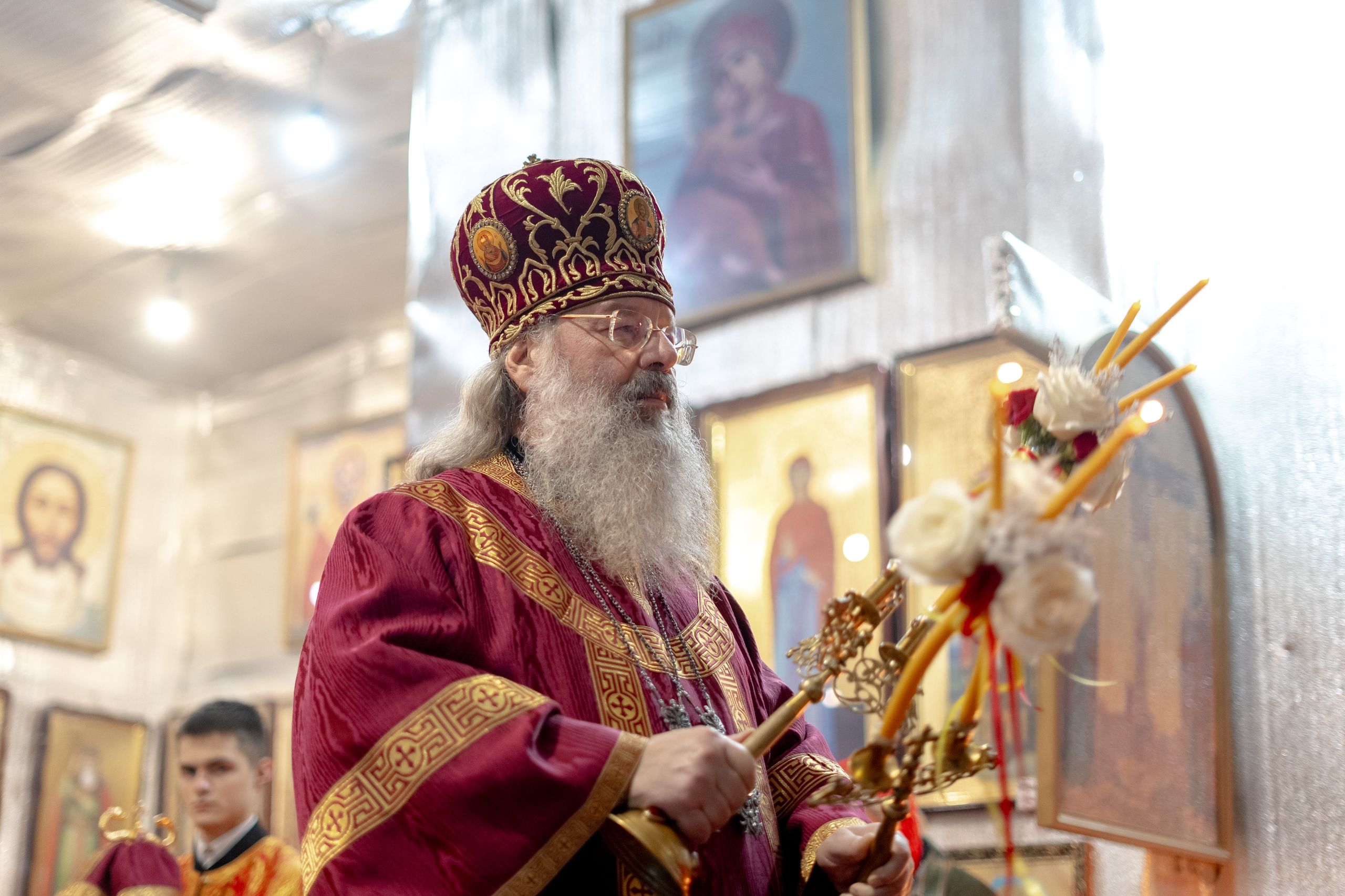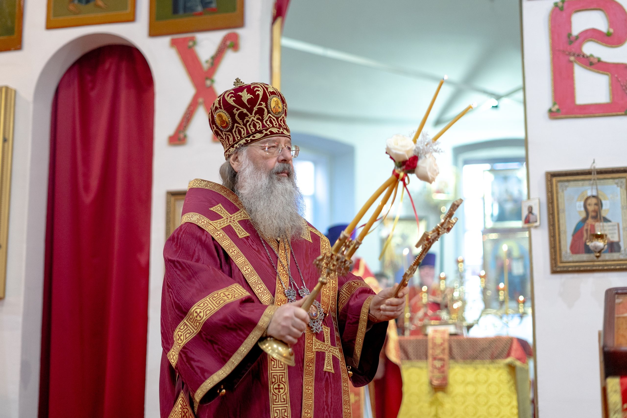 Настоятель Софийского собора иерей Сергий Гришин поблагодарил архипастыря за совместную молитву и попечение о приходе и преподнёс на молитвенную память икону Спасителя.