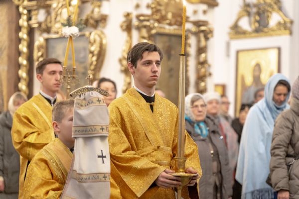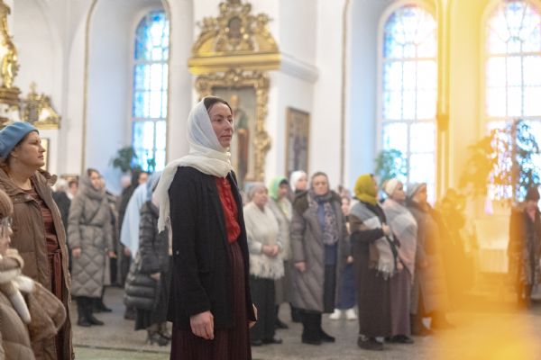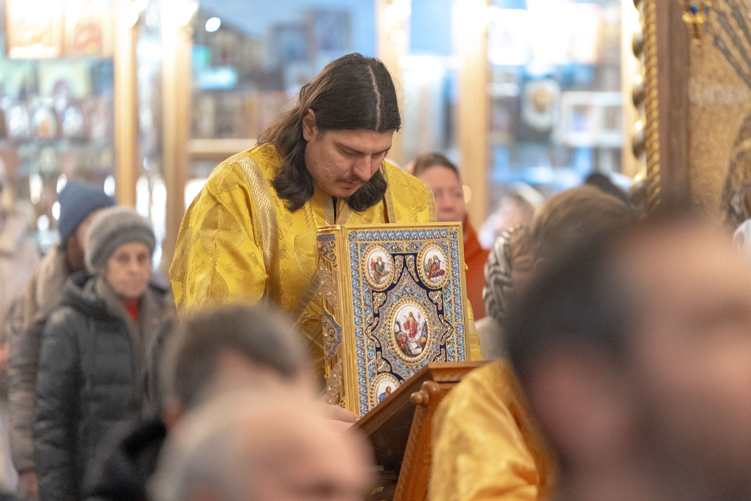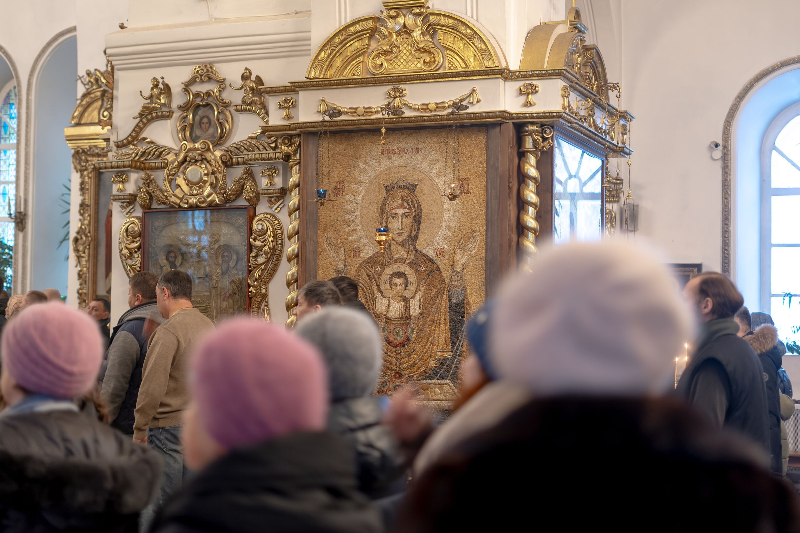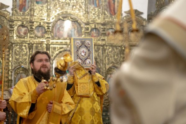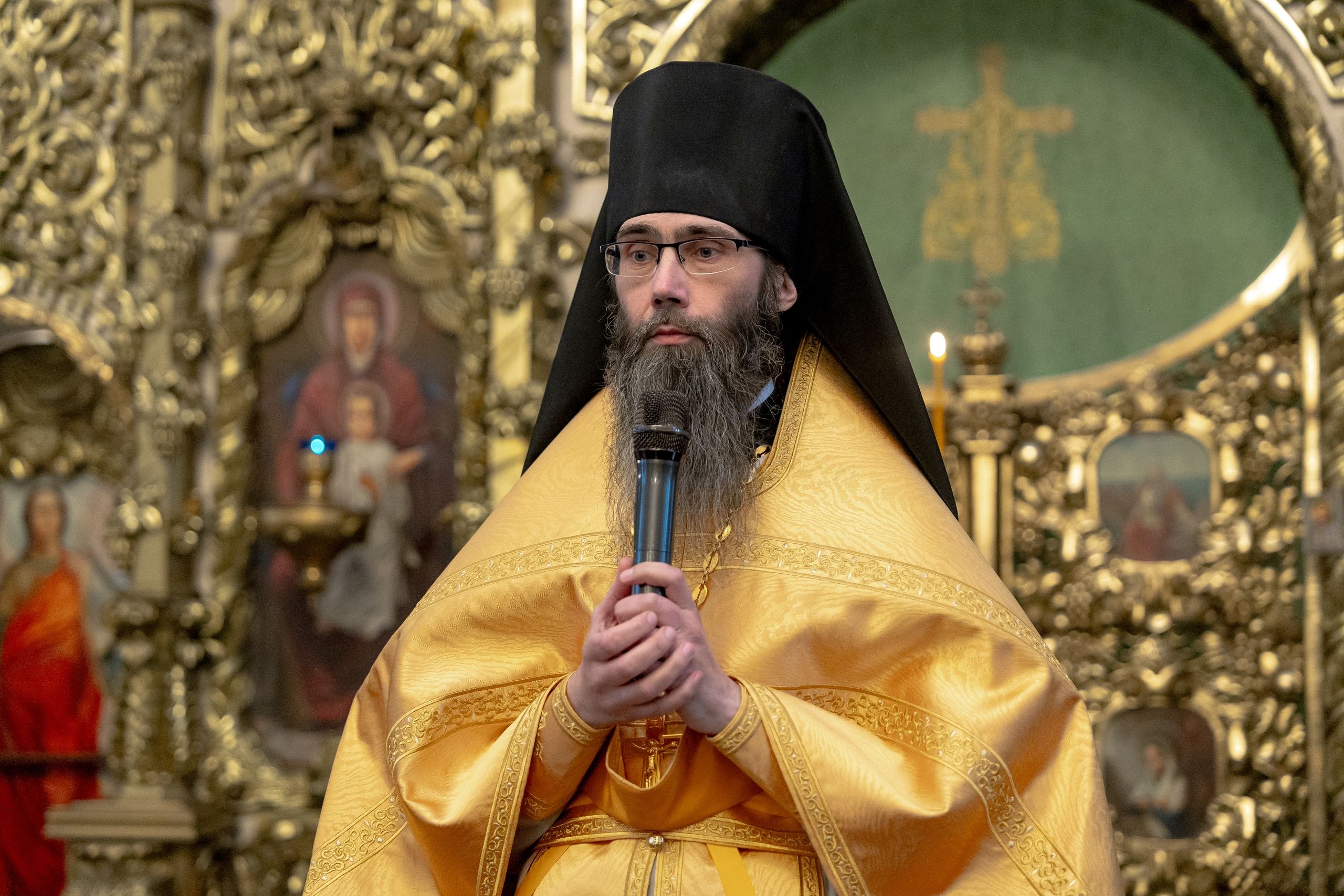 На мирной и сугубой ектениях были вознесены молитвы о Российском воинстве и о мире. По запричастном стихе проповедь произнёс игумен Пимен (Ивентьев).
