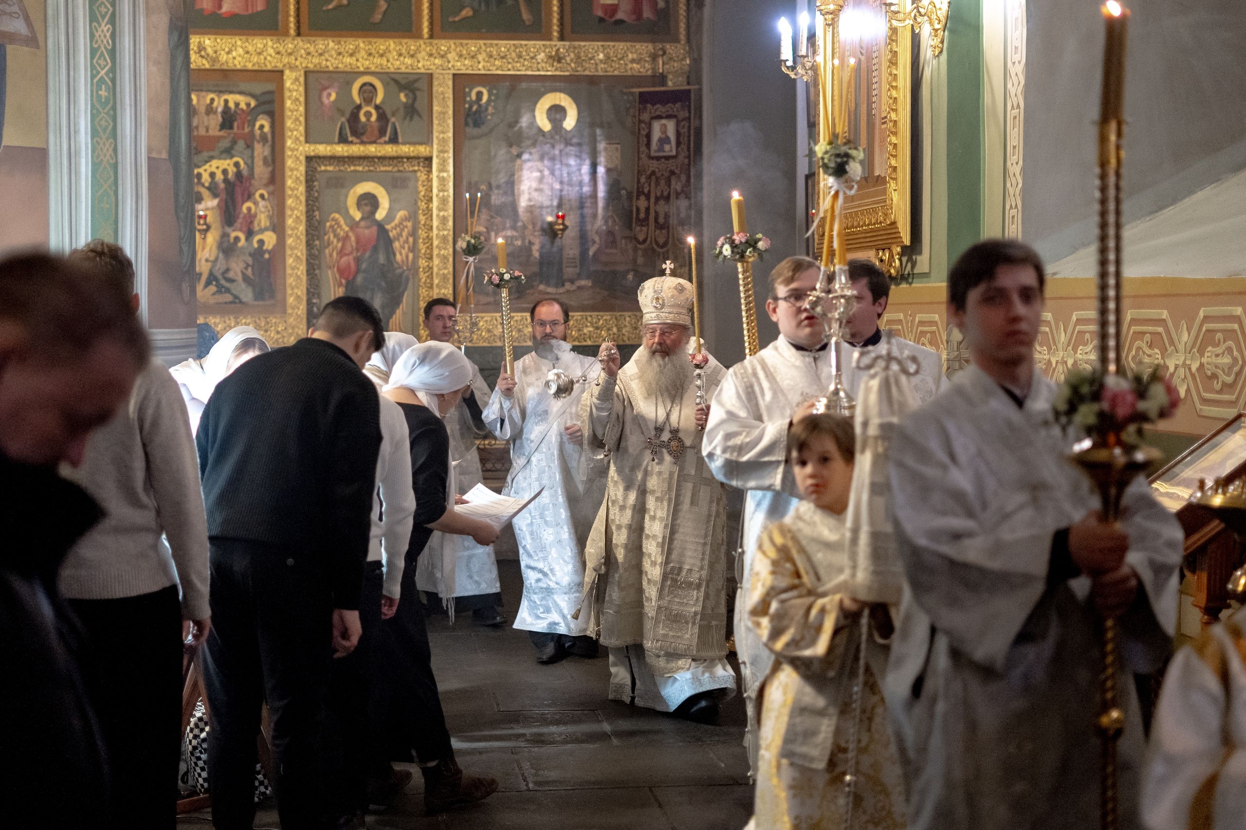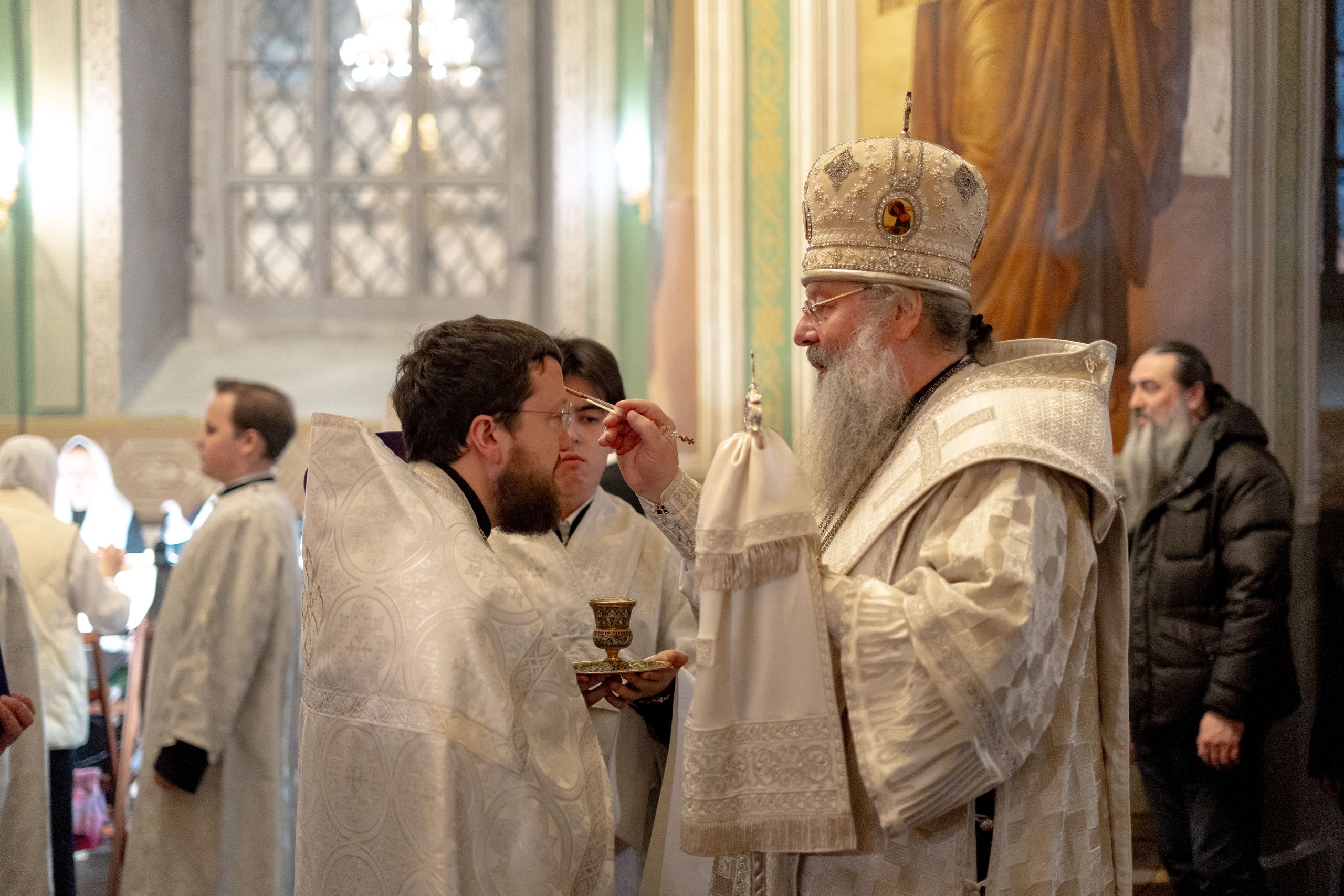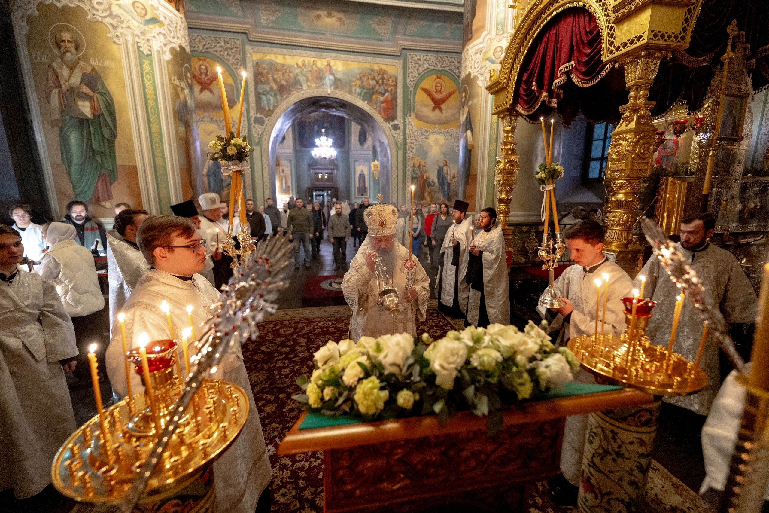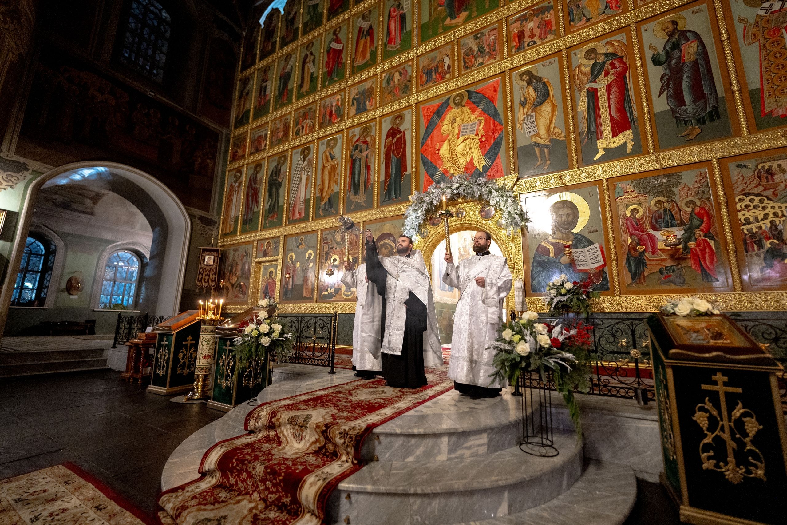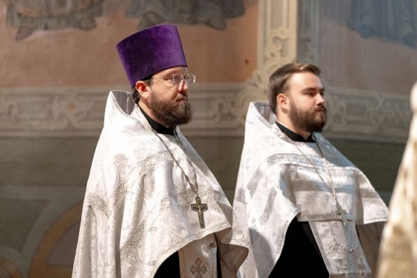 Его Высокопреосвященству сослужили благочинный I Казанского округа протоиерей Владимир Самойленко, ключарь Благовещенского собора иерей Виктор Бельских, клирик собора иерей Александр Махов, клирики храма преподобного Серафима Саровского города Казани иерей Никита Ярош и иерей Роман Ермолаев.