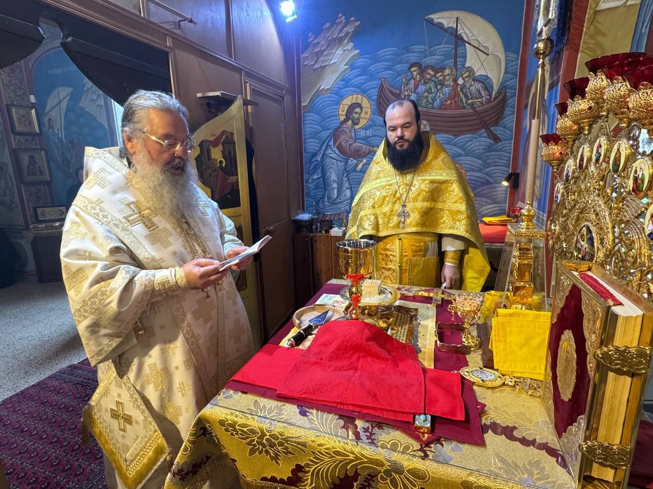 Его Высокопреосвященству сослужили секретарь Татарстанской митрополии иеромонах Кирилл (Корытко), наместник Казанского Богородицкого мужского монастыря города Казани игумен Марк (Виленский).