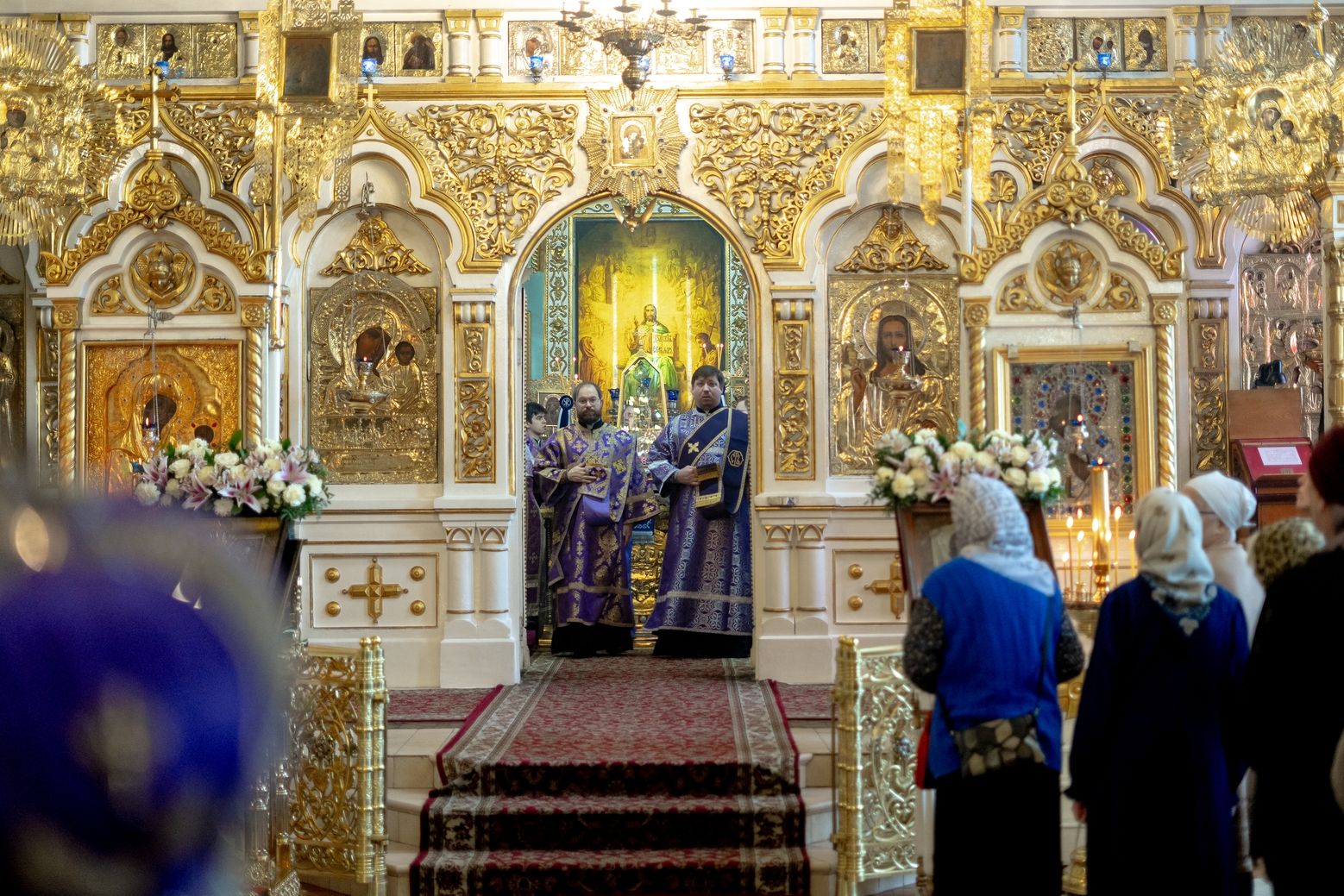 Его Высокопреосвященству сослужили секретарь Татарстанской митрополии иеромонах Кирилл (Корытко), благочинный I церковного округа города Казани протоиерей Владимир Самойленко, настоятель Никольского собора протоиерей Иоанн Барсуков, клирики прихода – протоиерей Николай Тимофеев и иерей Константин Колыганов, клирик храма благоверного князя Александра Невского города Казани протоиерей Александр Хохлов.