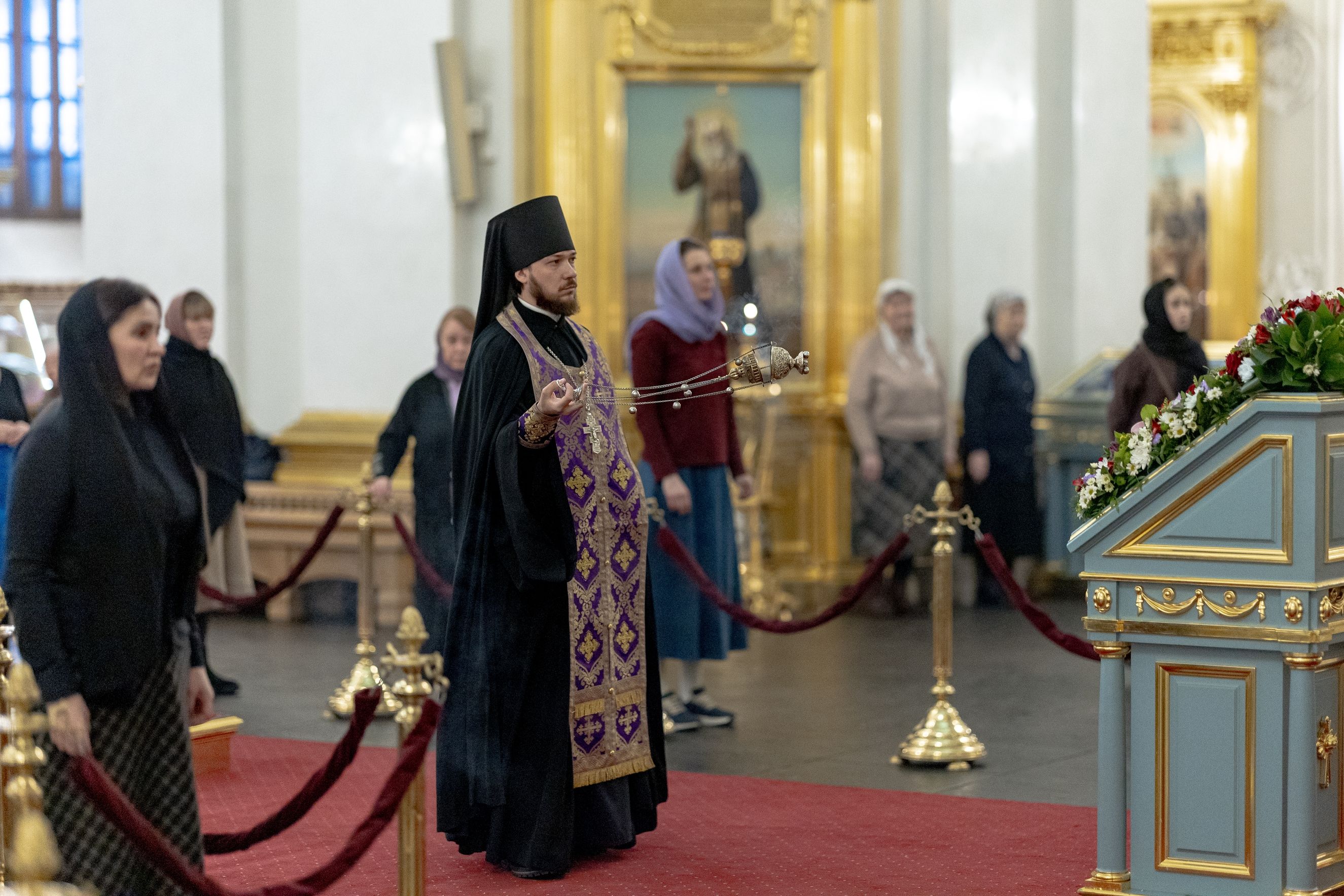 Отец Кирилл упомянул в проповеди, что в понедельник будет совершаться день памяти святителя Гермогена, Патриарха Московского и всея Руси. Благодаря его трудам мы с вами поем тропарь Казанской иконе Божией Матери. При его участии были обретены нетленные мощи святителей Гурия и Варсонофия, после чего святыни были положены в Спасо-Преображенском монастыре Казанского кремля. Известно, что святитель Гермоген написал жития этих святых, а также сказание о явлении Казанской иконы Божией Матери.