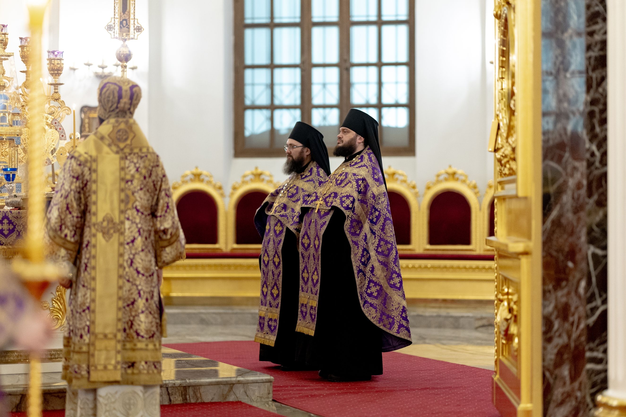 Архипастырям сослужили иеромонах Кирилл (Забавнов), ключарь Благовещенского собора Казанского кремля иерей Виктор Бельских, братия обители в священном сане.