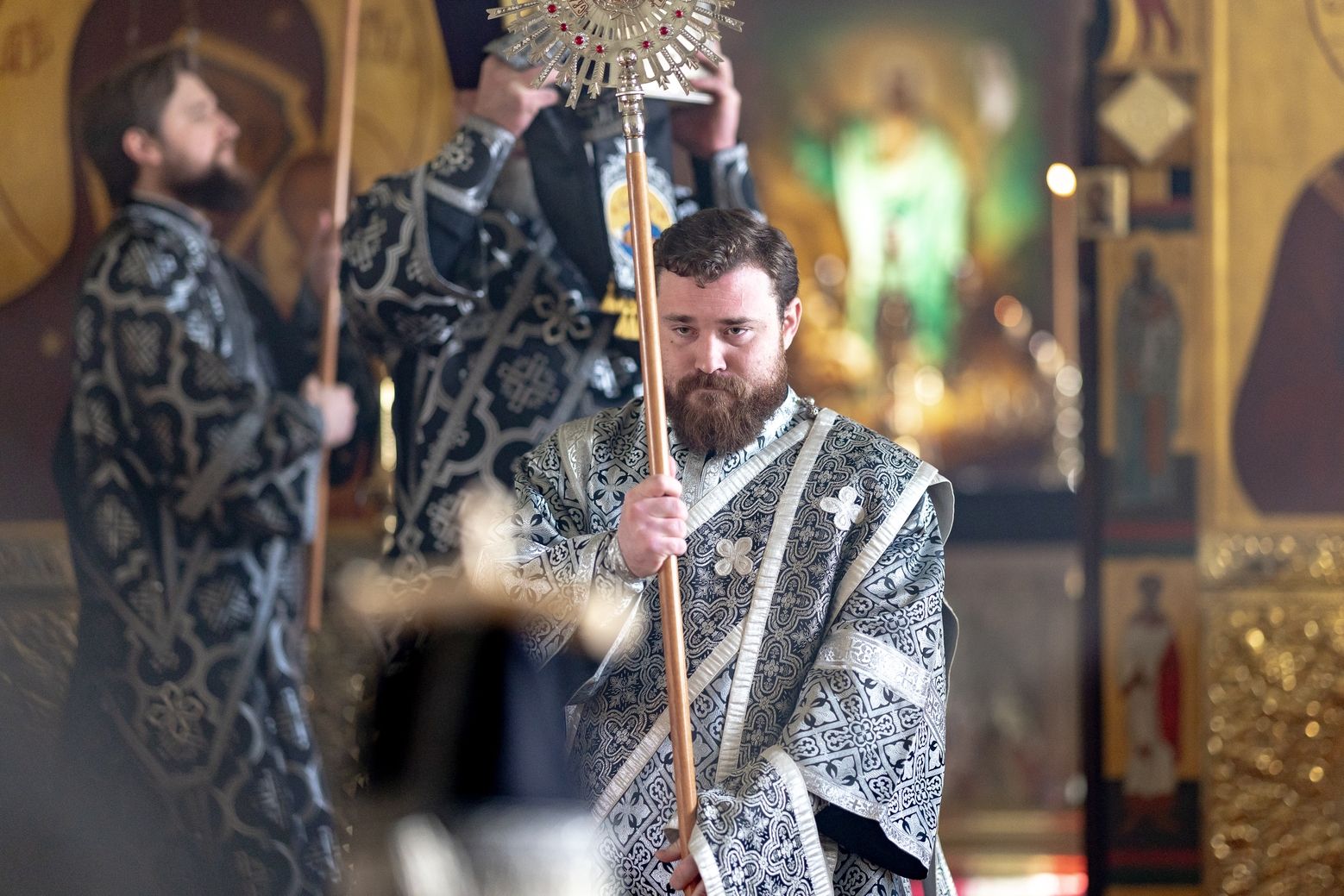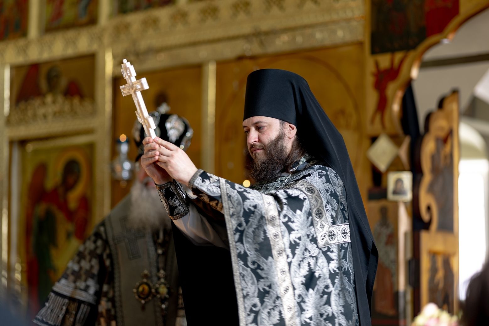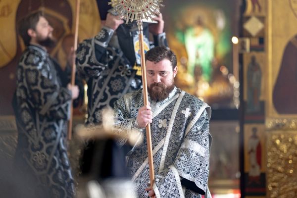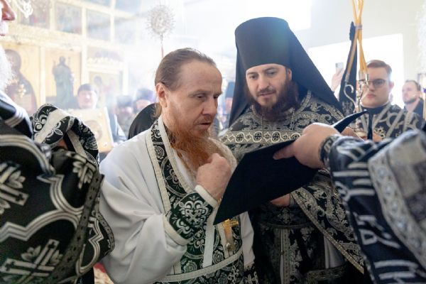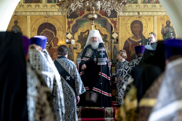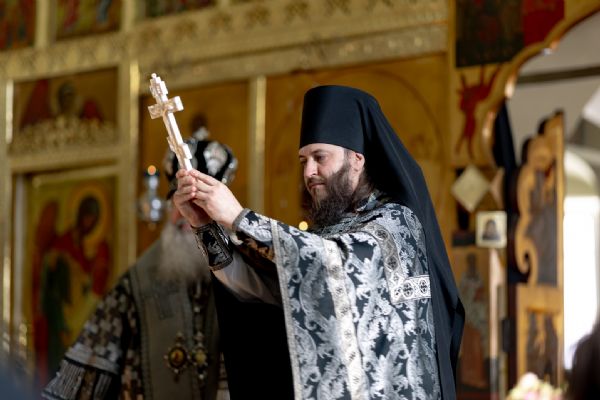 На мирной и сугубой ектениях были вознесены молитвы о Российском воинстве и о мире. На малом входе митрополит Кирилл вручил Патриаршую богослужебно-иерархическую награду: насельник Иоанно-Предтеченского монастыря иеромонах Иоанн (Илькин) был удостоен права ношения палицы. По запричастном стихе проповедь произнёс протоиерей Артемий Владимиров.