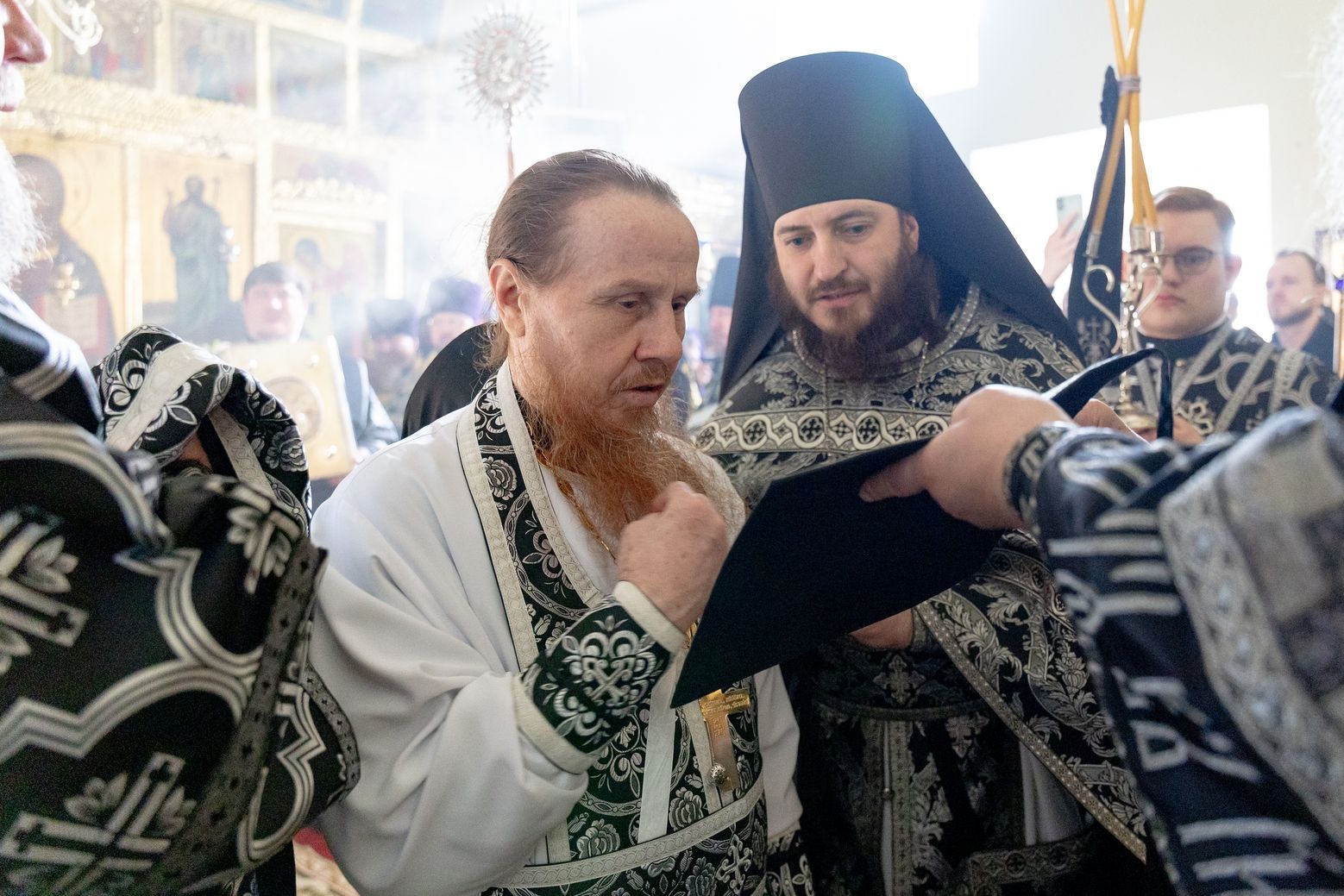 Его Высокопреосвященству сослужили секретарь Татарстанской митрополии иеромонах Кирилл (Корытко), благочинный монастырей Казанской епархии игумен Пимен (Ивентьев), настоятель обители игумен Алексий (Яцейко), настоятель храма Живоначальной Троицы на Шаболовке города Москвы протоиерей Артемий Владимиров, настоятель Петропавловского храма города Зеленодольска протоиерей Святослав Мирганиев, ключарь Благовещенского собора Казанского кремля иерей Виктор Бельских, настоятель Богоявленского храма села Анатыш (Рыбно-Слободский район РТ) иерей Дионисий Ветошкин, настоятель храма прпеодобного Сергия Радонежского села Большое Подберезье (Кайбицкий район РТ) иерей Олег Медведев, братия обители в священном сане.