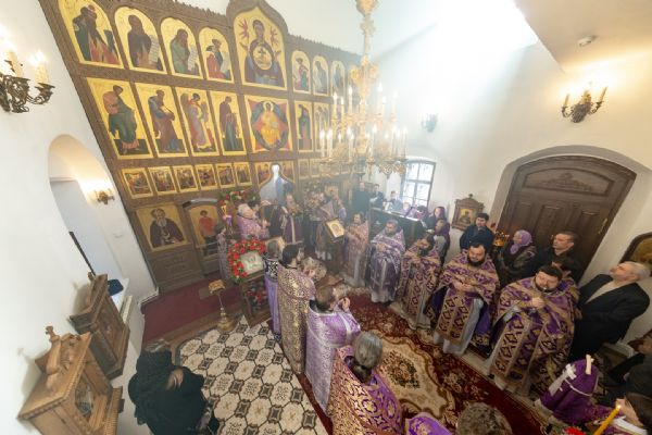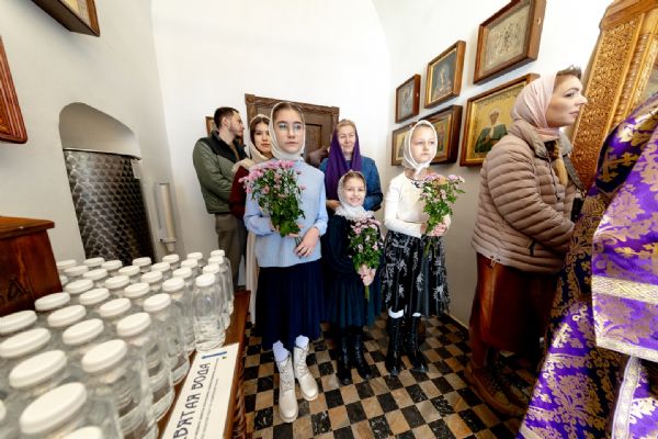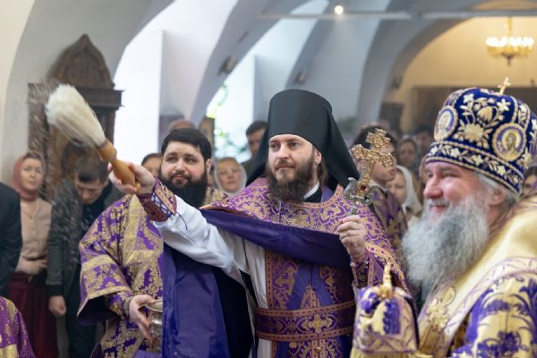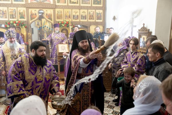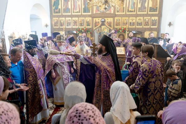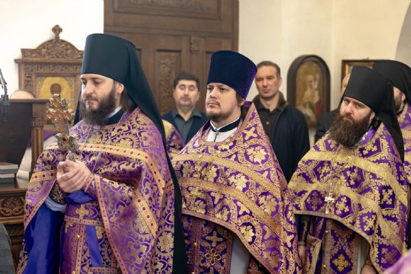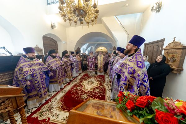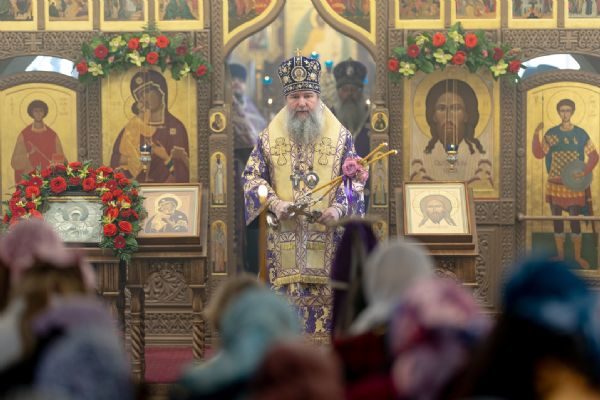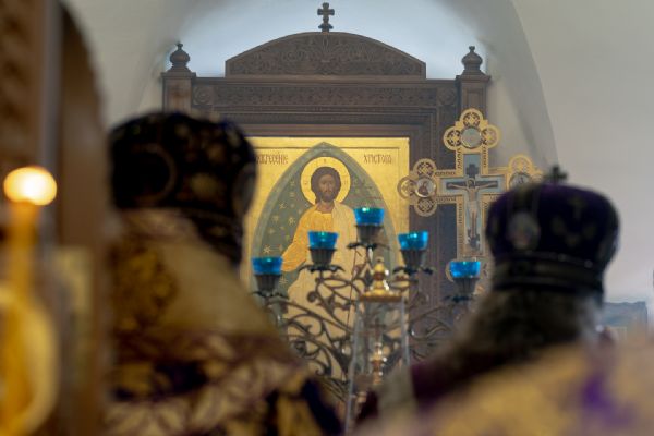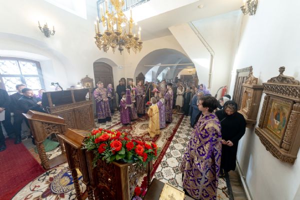 На мирной и сугубой ектениях были вознесены молитвы о Российском воинстве и о мире. Проповедь по запричастном стихе произнёс иеромонах Кирилл (Забавнов). В завершение Литургии было совершено славление преподобномученице Евдокии. Также было возглашено многолетие Святейшему Патриарху Московскому и всея Руси Кириллу, 50-летие архиерейской хиротонии которого отмечается сегодня.