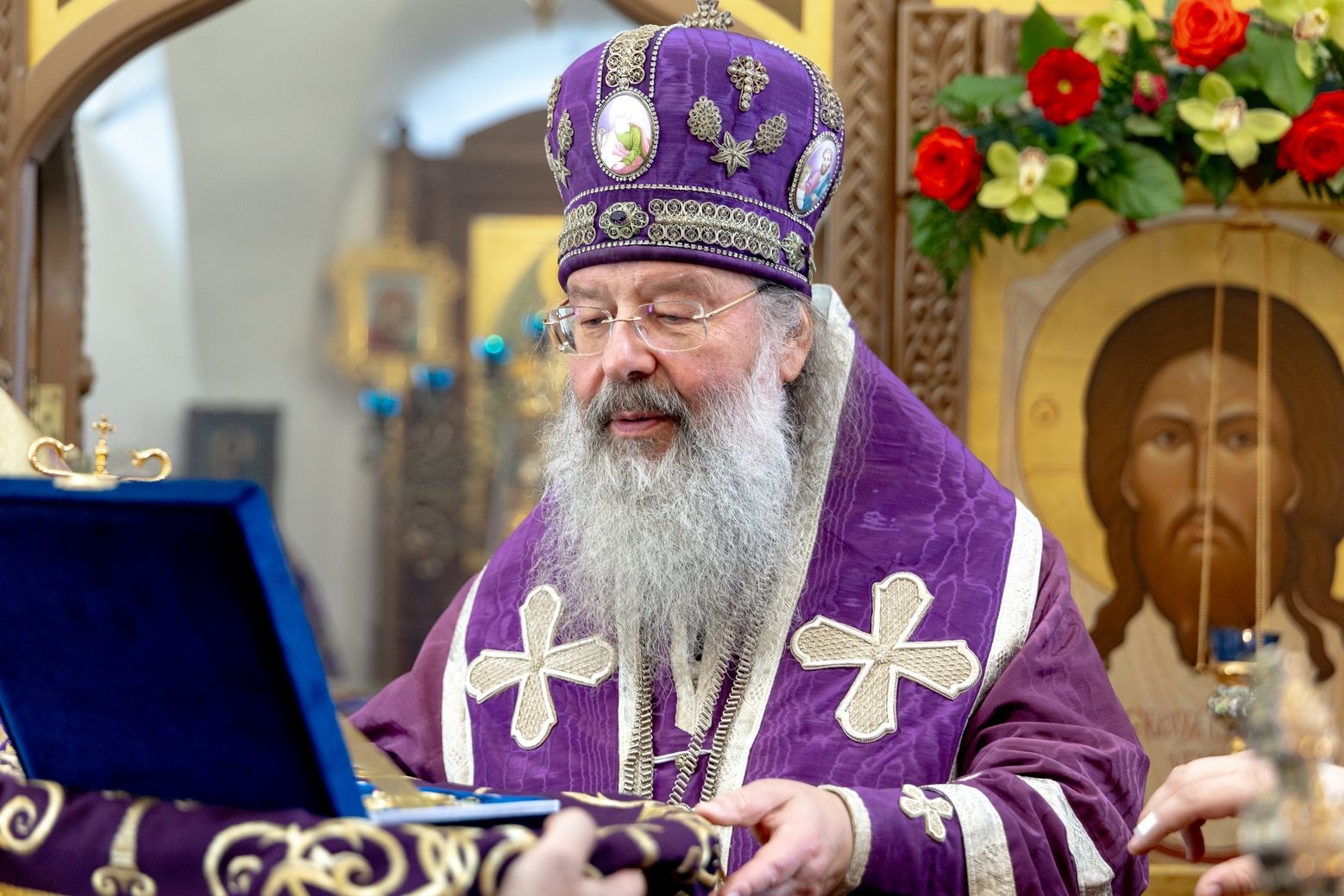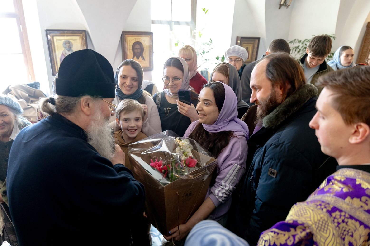 Затем священник преподнёс владыке Кириллу панагию и букет цветов.