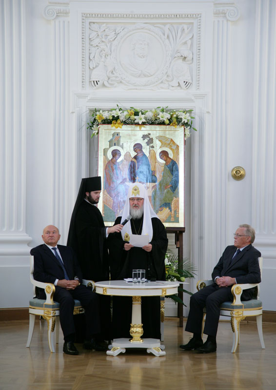После церемонии вручения премии, включающей в себя денежную составляющую и собрание сочинений митрополита Макария (Булгакова), Святейший Патриарх Кирилл вновь обратился со словом к присутствующим.