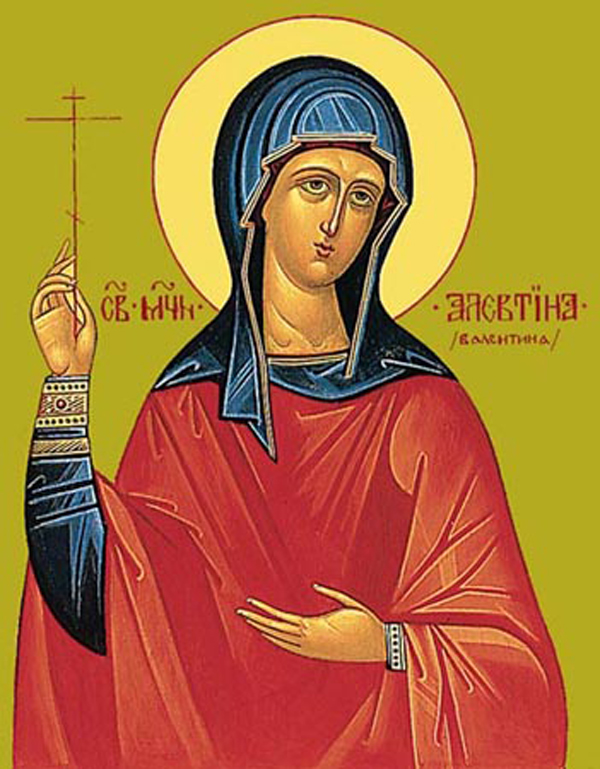 О святой Валентине, известной также под именем Алевтина, известно лишь то, что она вместе с сестрой святой мученицей Хионией и святым мучеником Павлом была родом из Египта. Во время гонения на христиан императора Максимина (305-313 гг.) они сначала осуждены были на тяжкие работы в каменоломнях, потом вместе с другими исповедниками Христа приведены в Кесарию Палестинскую, где после ужаснейших истязаний святые сестры мученицы Алевтина и Хиония были сожжены, а святой мученик Павел усечен мечом. Святые пострадали в 308 г.