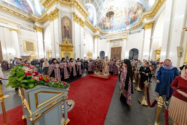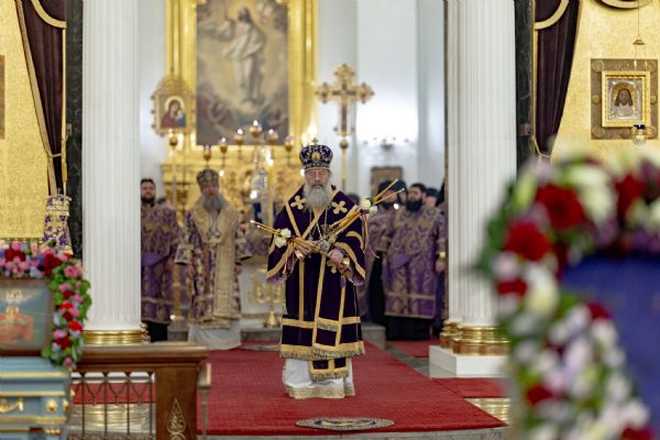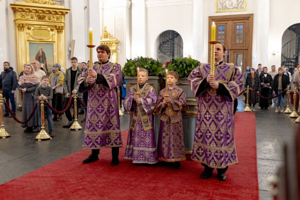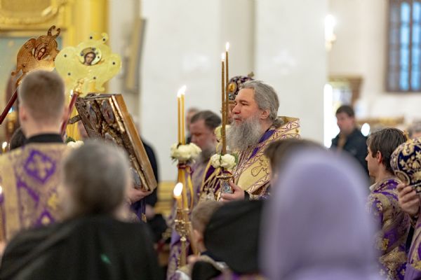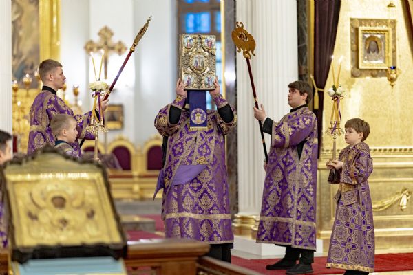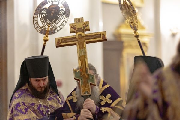 После великого славословия был совершён чин выноса Креста Господня. При пении «Святый Боже…» архипастыри изнесли Крест из алтаря и положили его на центральный аналой для поклонения верующих.